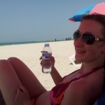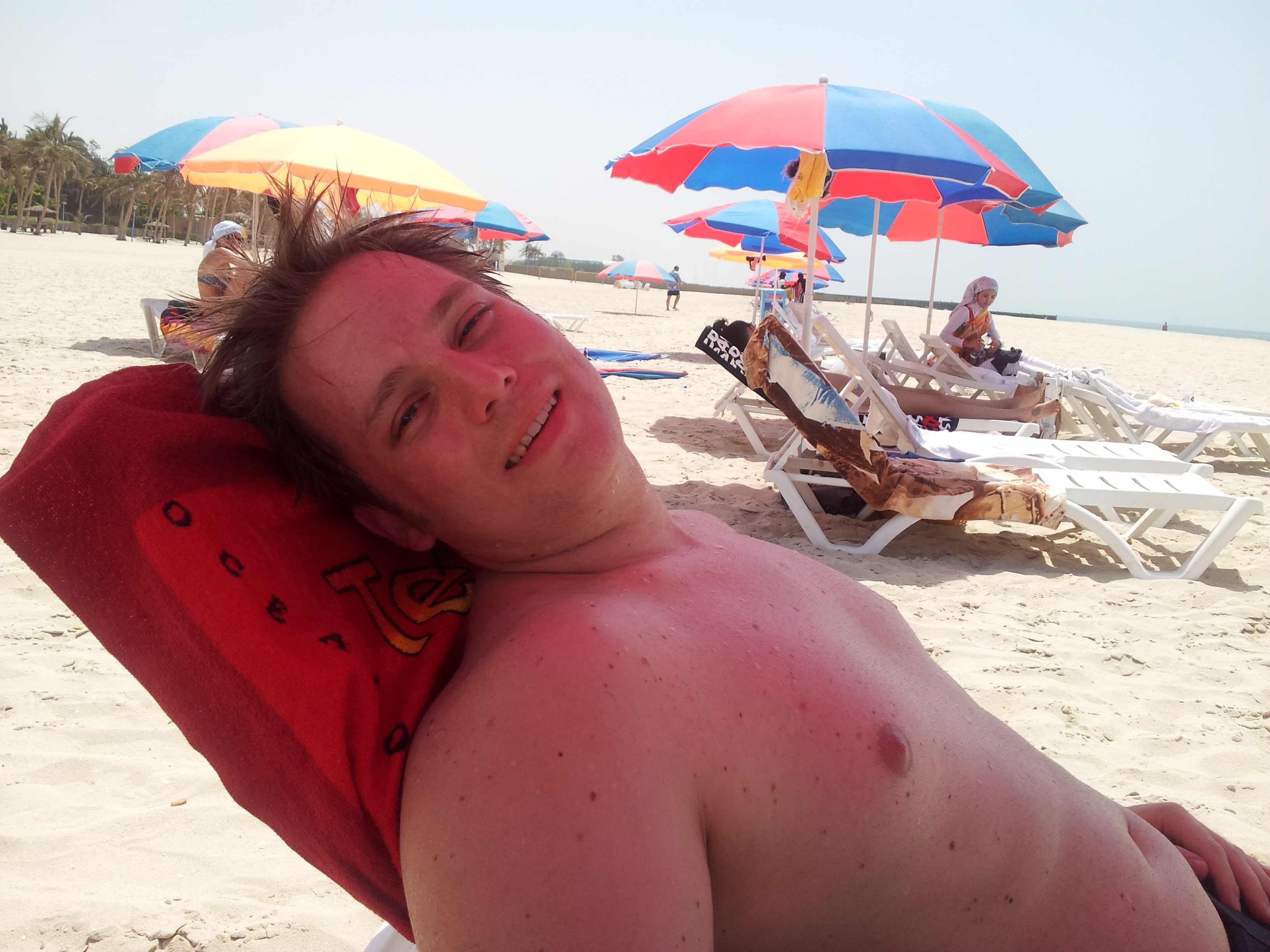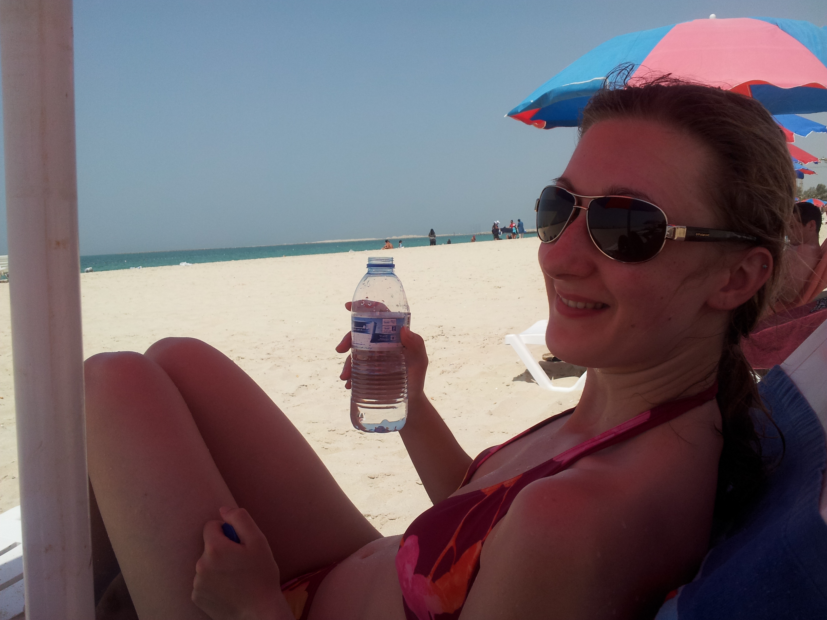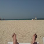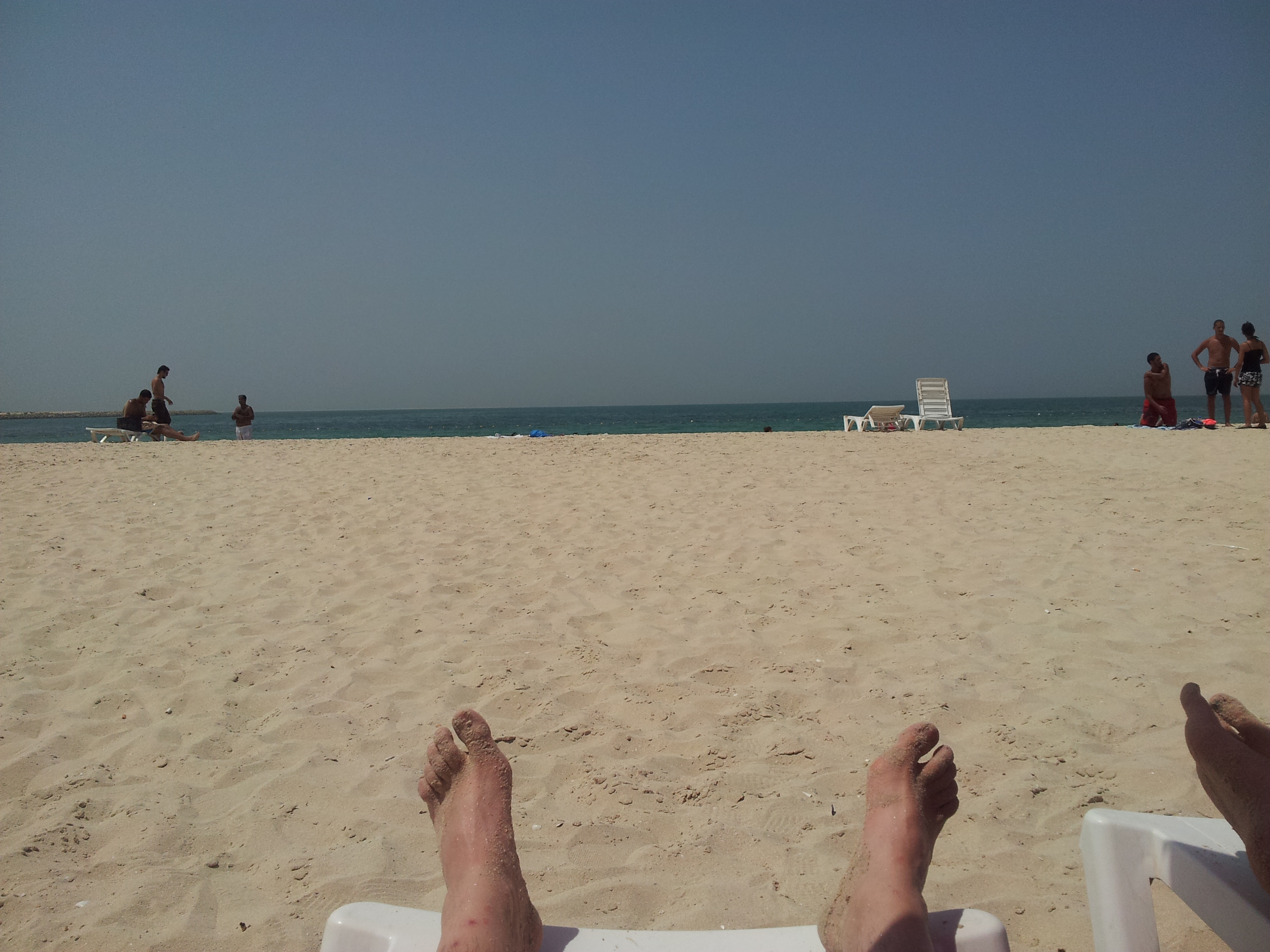 Das ganze dauerte ca. 10 min. und wir waren schon direkt komplett durchgeschwitzt. Daraufhin beschlossen wir schweren Herzens das Mahl lieber im klimatisierten Essbereich zu beenden. Nach dem etwas anderen Frühstück entschlossen wir uns einstimmig dazu das wohl am sinnvollsten zu tun was man bei der Hitze machen kann. Wir fuhren zum Strand und freuten uns auf eine Abkühlung im persischen Golf. Also schnell zur Metro und den restlichen Weg mit dem Taxi zum Strand. Dort angekommen, entledigten wir uns unserer Kleidung. NEIN nicht das was ihr jetzt denkt, den Badedress hatten wir noch an ;-). Der Strand war auch eher ein sehr konservativer public beach, an dem weder gefilmt noch fotographiert werden durfte. Nach einer Weile allerdings merkten wir, dass sich dort so gut wie niemand daran hält, woraufhin wir dann auch ein paar Schnappschüsse machten.