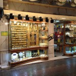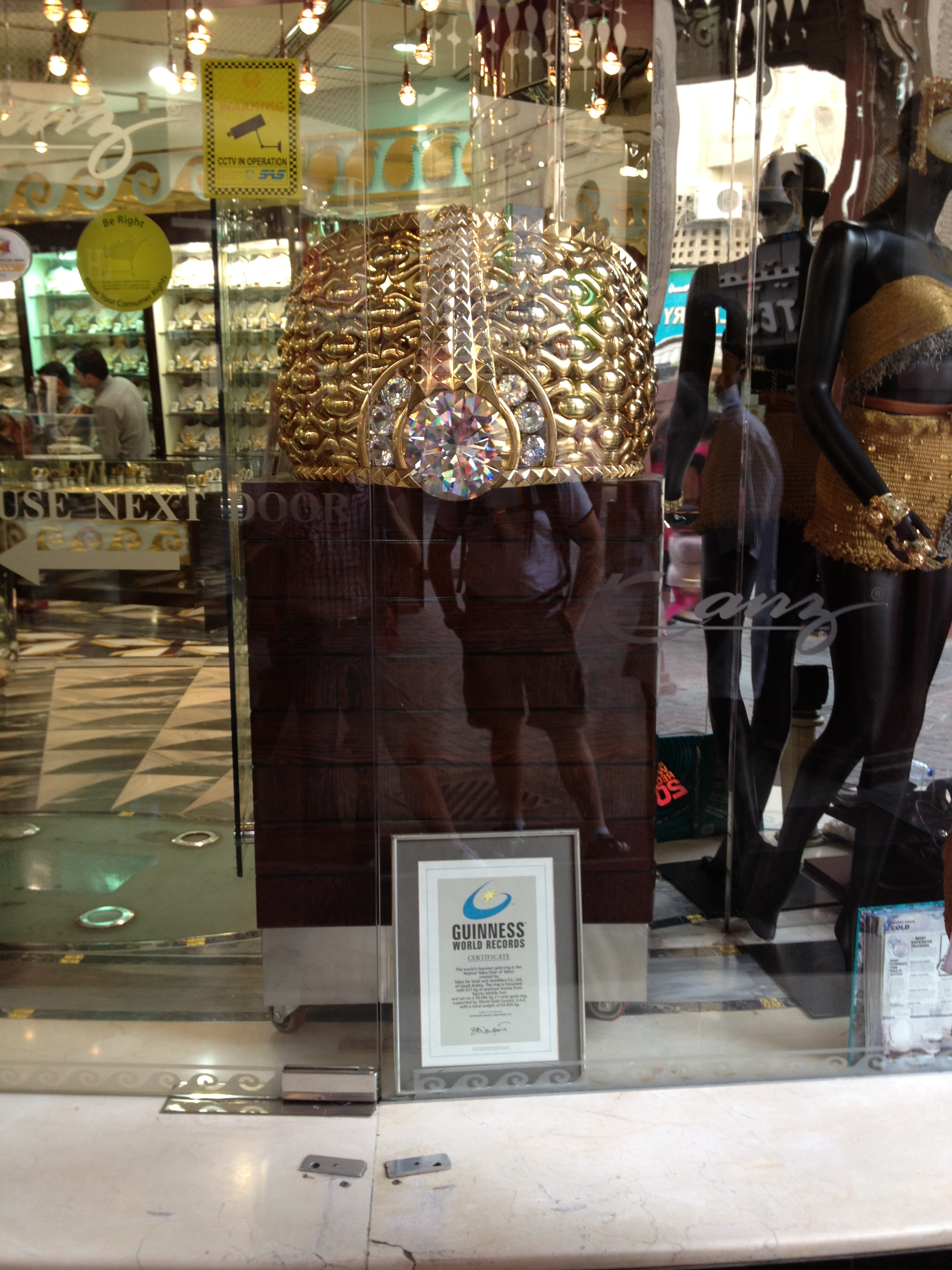 Na ja wie dem auch sei, wir kamen am Strand an, „konfigurierten“ unseren Badedress und dann ab ins Wasser, ach nee vorher noch eincremen, ganz wichtig bei der irren Sonne hier unten. Aber jetzt ab ins Wasser und abkühlen. Denkste. Am Wasser angekommen, der nächste Schock. DAS WASSER WAR SUPER WARM (schätzungsweise mindestens 30°C, eher etwas mehr, da es sich wie in der Badewanne angefühlt hat). Doch nix mit Erfrischung. Wir mussten leider feststellen, dass es scheinbar einfach nicht möglich ist, sich in Dubai abzukühlen. Die einzige Möglichkeit ist wohl in irgend ein klimatisiertes Gebäude zu rennen (und davon gibt es sehr sehr sehr sehr viele in Dubai – sogar die Bushaltestellen sind zum Teil klimatisiert) und dort eine gewisse Zeit zu verweilen. Aufgrund dieser Tatsachen, haben wir nicht viel Zeit am Strand verbringen können, weil es einfach zu heiß war für einen Mitteleuropäer, und nicht zuletzt da wir dieses Jahr so gut wie keine Hitze hatten. Vom Strand geflüchtet gings wieder mit Taxi und Metro erst einmal wieder zurück ins Hotel um den Körper auf Normaltemperatur zu bringen und vom fieberartigen Zustand zu befreien. Nachdem dies vollbracht war wagten wir uns nochmal zur Tür hinaus. Schließlich wollten wir die zwei Tage Stopover in Dubai nicht im Hotel verbringen und noch etwas Sehenswertes bestaunen. Wir entschieden uns daher nochmal in Richtung Küste zum „Gold Souk“, dem Goldmarkt zu fahren. Als wir dort ankamen, trauten wir unseren Augen kaum. So viel Gold an EINEM Ort haben wir zuvor nie gesehen. Egal wo man hinschaute, Gold, Silber, Juwelen und Diamanten. Alles funkelte. Etwas lustig fanden wir manche Ketten, die man scheinbar um den Hals tragen sollte. Diese waren so groß und wohl auch so schwer, dass man, alsbald man sie um den Hals hat, den Kopf nicht mehr vom Boden heben konnte. Über Preise können wir nichts sagen, da keine Preisschilder an den Exemplaren angebracht waren. Fragen wollten wir auch nicht, da es uns vom Wetter schon schwindlig genug war ;-). Ein kleiner Negativpunkt gibt es dann doch noch zu erwähnen. Vor jedem Geschäft standen doch sehr sehr aufdringliche Leute, die einen in ihr Geschäft befördern wollten. Mit Sprüchen wie: „Hi my friend, what do you need? Rolex, bags, watches, etc.“ Na ja, das kennt man auch aus Teilen Europas, von daher nichts neues. Das Problem war eher, dass sie mindestens 20m neben einem her sind und beschwatzt haben, obwohl man ihnen mitgeteilt hat, dass man kein Interesse hat. Auf der anderen Seite muss man sagen, dass wir uns schon ein bischen geehrt gefühlt haben, dass sie uns für so betucht gehalten haben, dass wir scheinbar in der Liga spielen könnten. 😛