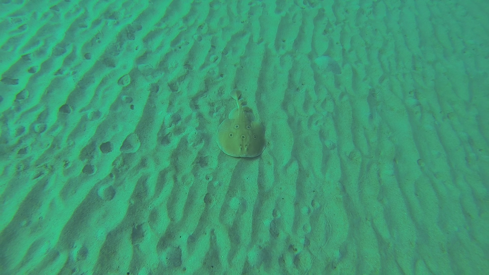 Doch plötzlich in Bennys Augenwinkel war er. Ein Fisch! Und auch ein vergleichsweiser sehr großer Fisch in etwa 3m Tiefe. Nach Bennys erster Vermutung, die sich später auch bestätigte, war es ein Rochen. Genauer ein gefleckter Zitterrochen. Laut Wikipedia können sie Spannungsstöße von bis zu 200V abgeben um ihre Beute zu lähmen um sie dann zu verspeisen. Dies wussten wir aber zu diesem Zeitpunkt noch nicht. Benny filmte das Objekt der Begierde von allen Seiten, bis es sich plötzlich einbuddelte. Das fanden wir doch sehr blöd. Benny versuchte vorsichtig mit Hilfe des Kamerahalters auf den Sand zu klopfen um ihn wieder zum Vorschein zu bringen. Der erste Versuch blieb erfolglos. Der zweite Versuch allerdings führte dazu, dass der Rochen den Kamerahalter angriff, Benny am Finger berührte und sich dann wieder in Sekundenschnelle einen halben Meter weiter wieder einbuddelte. Sehr schade. Das Videomaterial ist allerdings sehr gelungen.