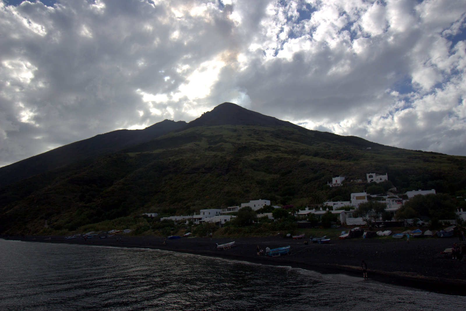 Der Ort Stromboli selbst ist sehr malerisch. Schwarzer Strand, weißgekalkte Häuser, die alle eine Dachterrasse haben, über die sie Regenwasser sammeln, denn auf der Insel gibt es keine Quellen; und darüber der doch erstaunlich grüne Vulkan. Wir schlenderten am Ufer entlang und erklommen dann einen Aussichtspunkt vor der Kirche.
