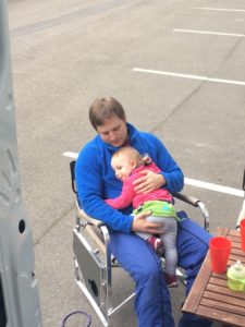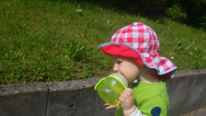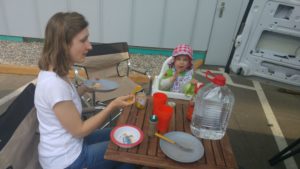 Da auf der Hinfahrt eine Leuchte am Armaturenbrett (ESP) angegangen war und Benny dann noch beim Aussteigen festgestellt hatte, dass etwas vorne tropfte, fuhr er noch zu einer Werkstatt und Mirjam ging mit Clara auf den Spielplatz, der auf der anderen Straßenseite war. Benny kam relativ schnell wieder zurück, da bei Jonny alles in Ordnung war. Das Wasser kam von der Klimaanlage (Kondenswasser) und da die ESP-Lampe nach einem Neustart wieder weg ging, gab der KFZler auch hierfür Entwarnung. Erleichtert genossen wir noch ein wenig die Sonne auf dem Spielplatz, während Clara alle möglichen Sandspielsachen ausprobierte, die sie dort fand. Dann ging es zurück zum Camper, um das Abendessen vorzubereiten. Miri hatte vorgekocht und wir mussten es nur noch aufwärmen. Aber da wir draußen im Freien aßen, schmeckte es allen noch mal richtig gut.