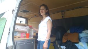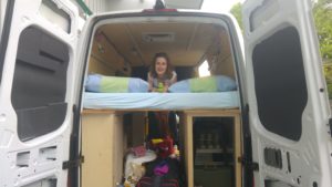 Dann mussten wir so langsam alles für die Nacht vorbereiten, was noch ein bisschen Aufwand bedeutet, da viele Dinge noch keinen festen Platz haben und somit hin- und hergeräumt werden müssen. Aber es fehlen ja auch noch einige Schränke und schließlich ist es die Jungfernfahrt, wir müssen auch erst noch ein paar Erfahrungen sammeln. Clara schlief recht gut ein, nachdem sie den Schock verdaut hatte, den ihr der Dachventilator verpasst hatte, den Mirjam unbedachterweise angeschalten hatte. Wir konnten dann auch noch ein bisschen auf den vorderen Sitzen im Internet surfen, waren aber auch gut müde, sodass wir es nicht sehr lange aushielten und uns auf unser neues Lager begaben. Wir hatten damit gerechnet, dass wir tendenziell eher frieren würden (denn beispielsweise die Türen sind noch quasi nicht isoliert), aber es hatte sich richtiggehend die Wärme gestaut und Clara war ziemlich geschwitzt. Zum Glück fanden wir noch heraus, wie wir das Dachfenster manuell ein paar Zentimeter öffnen können, und mussten somit nicht die Fernbedienung benutzen, die jeden Tastendruck mit einem Piepsen quittiert. Der Luftzug führte dann schnell zu einem angenehmeren Klima und wir konnten alle gut schlafen.