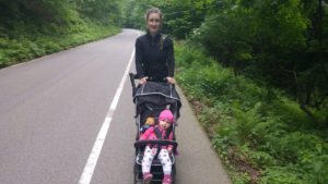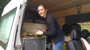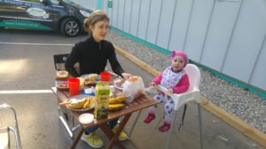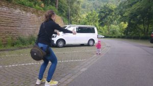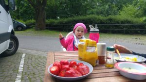 Als das Geschirr gespült war und wir gerade überlegten, ob wir noch einkaufen fahren sollten, bekamen wir die Info, dass unsere Matratzen fertig sind. Sie wurden reingelegt und passten perfekt. Wir sind echt glücklich mit der Lösung, wie es jetzt ist. Die Idee, das untere Teil mit einem Reißverschluss zu befestigen, die Frau Strobel hatte, war auch super. Clara bekam noch eine gehäkelte Puppe geschenkt (Frau Strobel wartet noch auf Enkel, die Söhne machen nicht hinne und somit hätte sie ja niemanden, wo sie die Produkte ihres Schaffenstriebs loswerden kann) und wir fuhren erst einmal noch einkaufen, bevor wir pünktlich zu Claras Mittagsschlaf Richtung Heidelberg aufbrachen. Dort hatten wir vor erst einmal zu kochen und versuchten deshalb einen Spielplatz mit Parkmöglichkeit zu finden, damit während einer kocht der andere sich mit Clara dort aufhalten kann. Das war aber etwas schwierig und nachdem wir fast in der Nähe der Fußgängerzone stecken geblieben wären, beschlossen wir, Richtung Schloss zu fahren, in der Hoffnung dass der große Schlosspark etwas hergab. Wir fuhren eine ziemlich krasse Serpentinenstraße hoch, aber oben angekommen fanden wir einen Parkplatz und Benny ging mit Clara in den Park, sodass Mirjam in Ruhe kochen konnte. Es gab einen Gemüseeintopf Eastern Style, der bei allen Familienmitgliedern gut ankam und Erdbeeren zum Nachtisch.