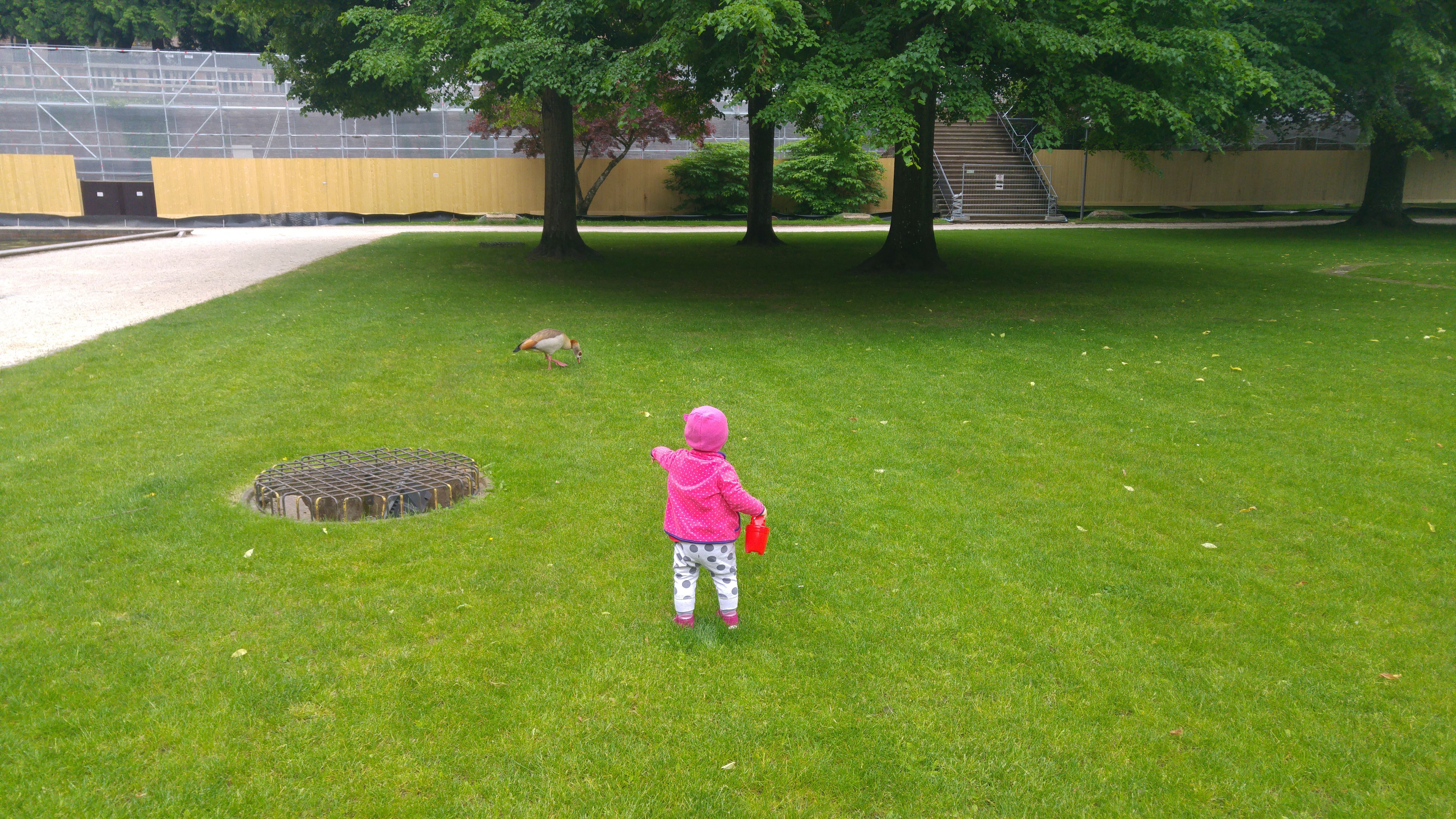Im Anschluss konnte sich Clara noch ein bischen auf dem Platz selbst austoben und fand im Gras u.a. eine tolle Ente, die sie sehr faszinierte. Am Ende des Platzes fanden Papa mit Töchterchen noch eine Grotte, die aber leider verschlossen war. Sie konnten nur durch ein Gitter ins Innere blicken. Die Zeit schritt voran und somit mussten beide wieder zu Johnny aufsteigen, da Mirjam das Essen fertig hatte.