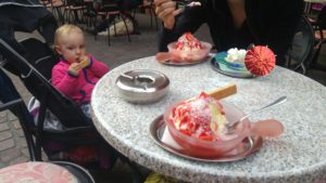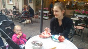 Nachdem alles wieder gespült und verstaut war machten wir uns auf den Weg zum Schloss – diesmal zu dritt – und von dort aus den ziemlich steilen Weg zur Stadt hinunter. Clara wollte stets selbst laufen und fand dabei allerhand Zeug dass sie sich am liebsten einverleiben wollte. Wir hatten also allerhand zu tun und waren froh, irgendwann eine nette Eisdiele zu entdecken. Da die Erdbeeren schon so gut geschmeckt hatten, bestellten wir Spaghettieis mit frischen Erdbeeren und für Clara eine Kugel Vanilleeis mit Sahne.