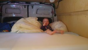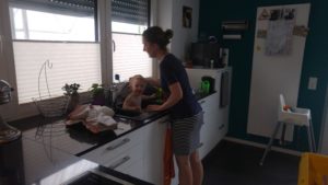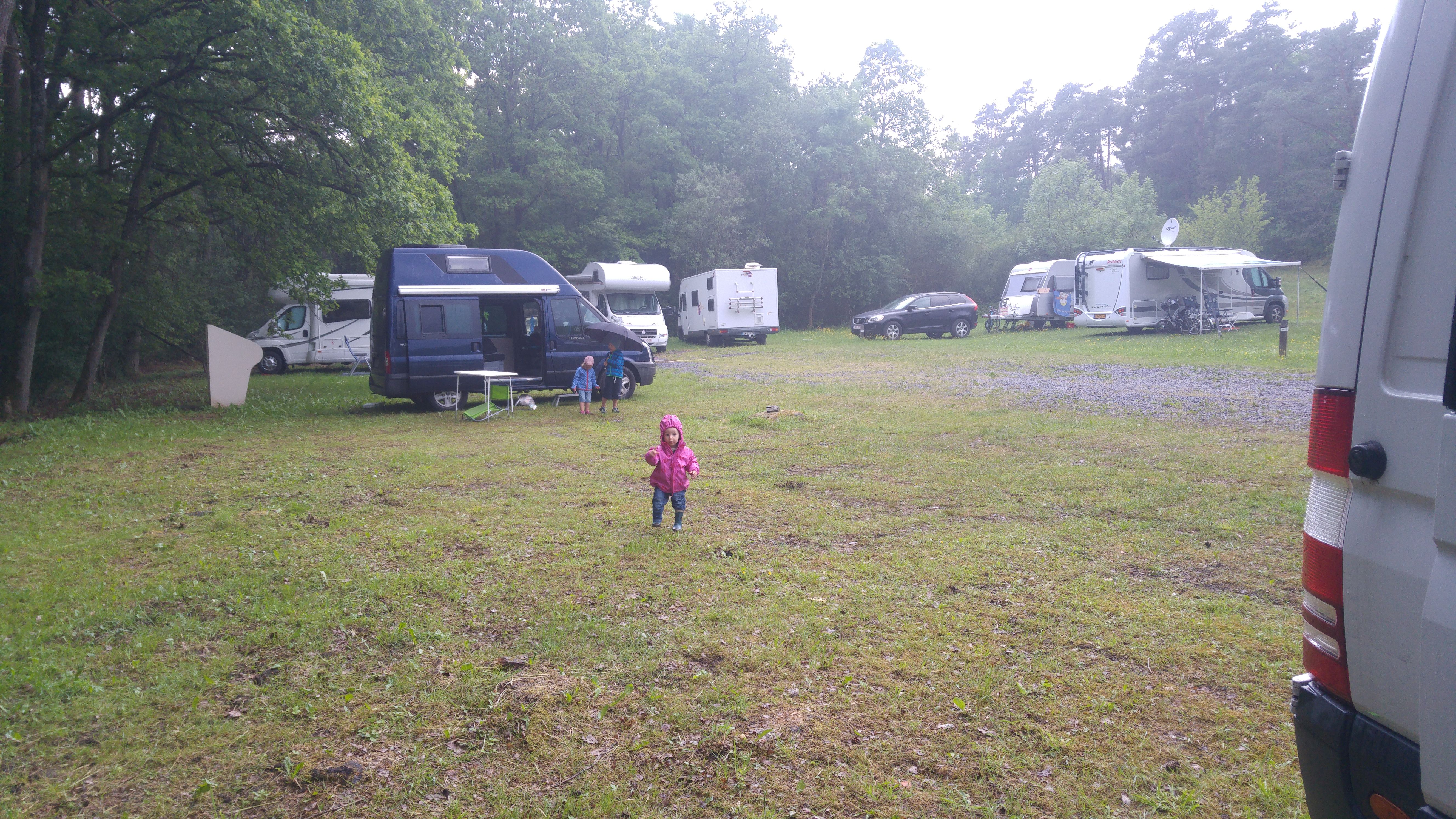 Es hatte zum Glück in der Nacht abgekühlt, aber als wir aufwachten, fing es an in der Ferne zu donnern. Wir hofften, unser Frühstück noch im Freien verbringen zu können, aber es fing vorher an zu schütten. Also hatten wir auch noch die Situation im Bus essen zu müssen. Es war eng, aber es ging. Clara verputzte zweieinhalb Frühstückseier (sonst wollte sie nichts) und auch die großen ließen es sich schmecken. Dann wurde der Regen langsam schwächer und Clara wollte wieder raus. Endlich kamen auch mal die Regenjacke und die Gummistiefel zum Einsatz.