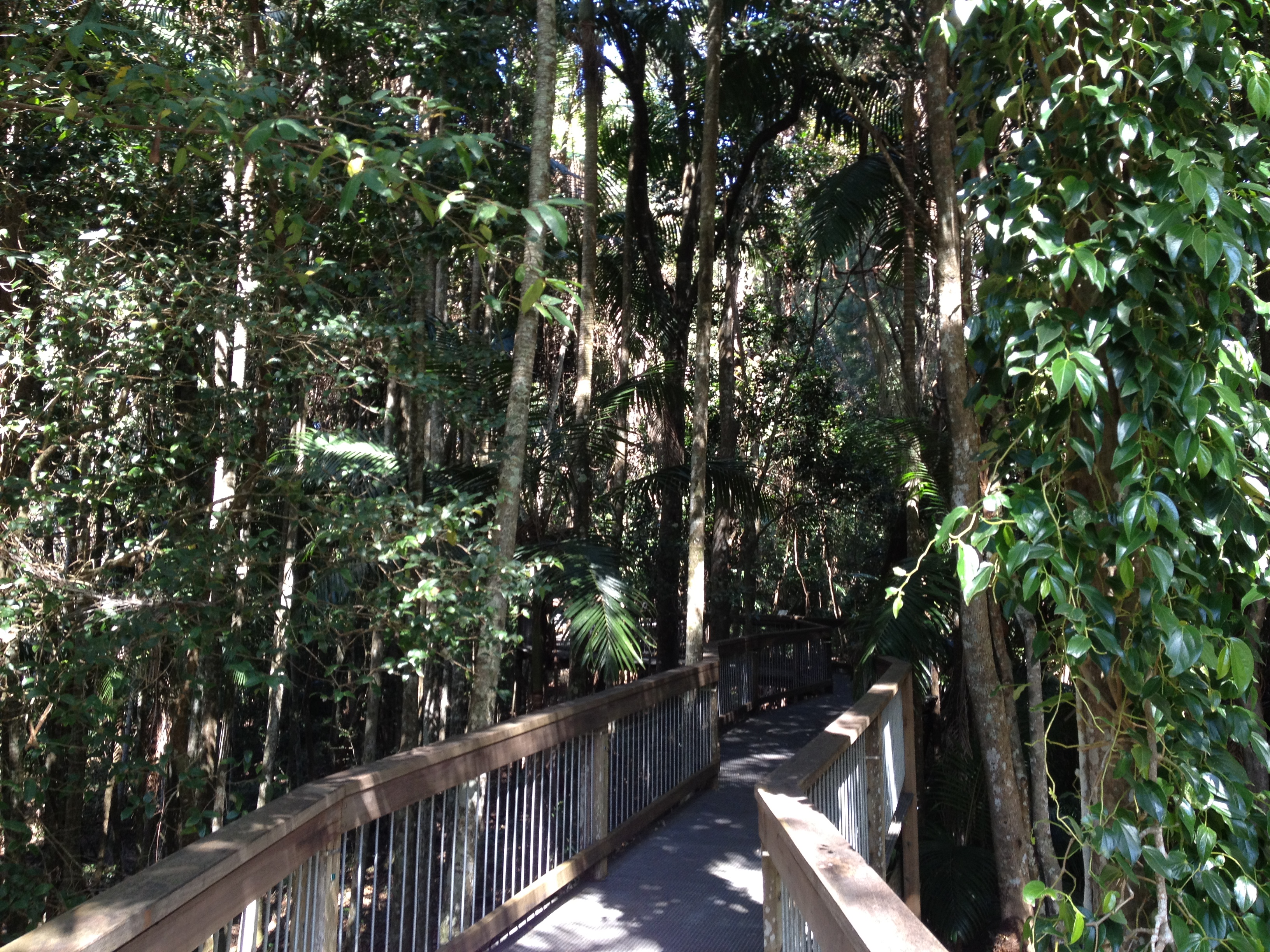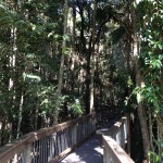 Nach kurzer Nachfrage haben wir dann herausgefunden, dass wir noch ein Stück fahren mussten. Kurz darauf kamen wir dann bei dem „Rainforest Centre“ an. Nachdem wir durch die Souvenirs gestöbert haben, ging es dann los. Durch den subtropischen Regenwald war ein Weg auf Stelzen angelegt worden und an interessanten Punkten konnte man Infos zu Pflanzen und Tieren des Waldes lesen. Diese Infos sollten uns später, wenn wir im „echten“ Regenwald, also ohne Stelzenwege, wandern sollten, noch nützlich sein.