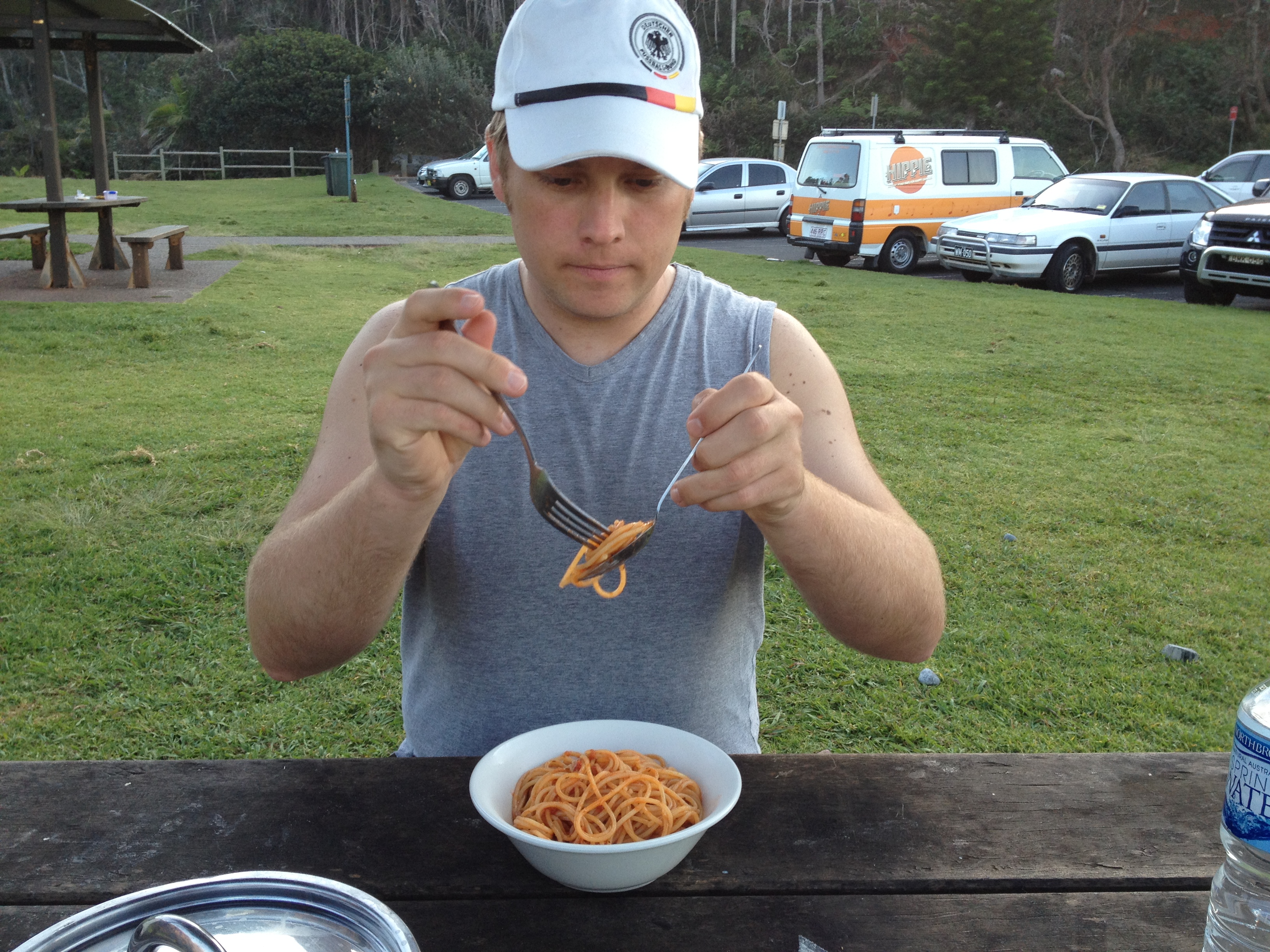 Außerdem war das wasser auch viel zu kalt zum Schwimmen, aber ein bisschen sonnen war drin. Nach einiger Zeit kehrten wir dann an den Haupstrand zurück, wo auch unser Camper stand und kochten uns Nudeln mit Tomatensoße, die wir auf einer Picknickbank mit Meerblick zu uns nahmen.