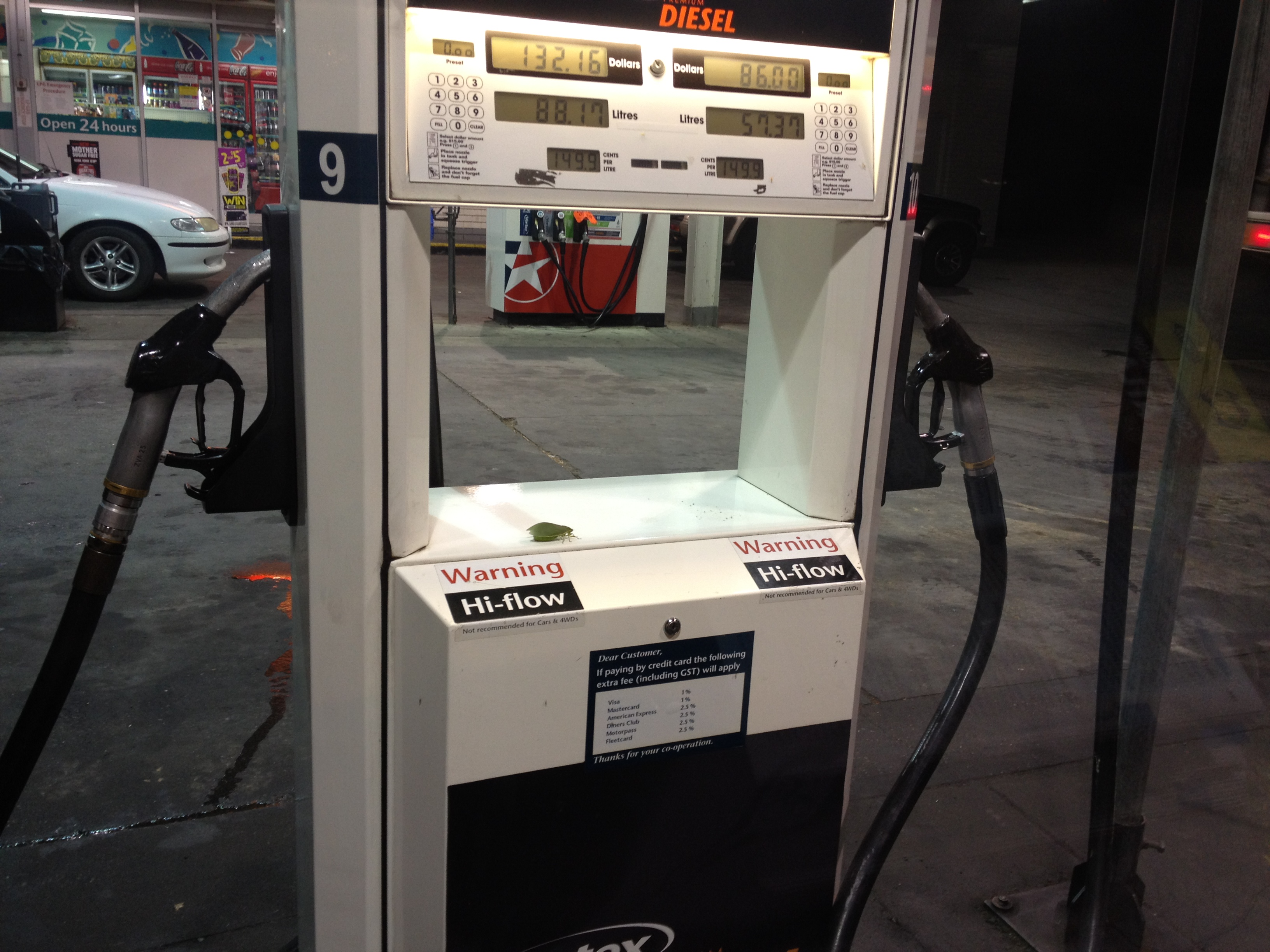 Nachdem wir noch Bekanntschaft mit einem Truthahn gemacht hatten (der scheint dort als so eine Art Mülleimer zu fungieren – alles was von den Touris zurück gelassen wurde wird von dem Vogel zerhackt, darunter war auch eine Tupperdose), machten wir uns dann auf den Weg zum nächsten Ziel: Coffs Harbour. Auf der Fahrt haben wir es uns selbst noch mal ein bisschen spannend gemacht, da wir mit fast leerem Tank los sind und dann feststellen mussten, dass viele australische Tankstellen schon um 18 Uhr die Schotten dicht machten. So kamen wir nach ca. 10 km an die erste Tankstelle. Die verlassene Umgebung ließ uns schlimmes vermuten. Die Tanke war zu. Wir drehten um und fuhren wieder zurück auf den Pacific Highway. Irgendwann fing die Tankleuchte an zu leuchten und die laut Google Maps nächste Tankstelle war noch 18 km entfernt. So langsam fingen wir an zu schwitzen, denn wir hatten keine Ahnung wie groß die Reserve wohl sein würde und ob diese Tankstelle wohl noch offen hat. Aber wir hatten Glück und wir schworen uns, nie wieder mit so leerem Tank loszufahren. 😉