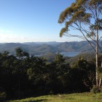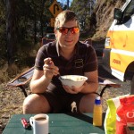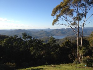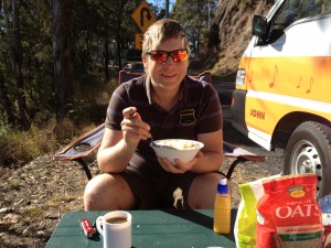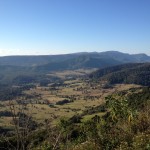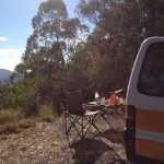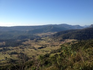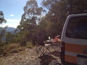 Der Lamington National Park kann von zwei Orten aus erwandert werden. Wir fuhren nach Bina Burra. Da das Visitor Centre noch nicht offen hatte (wir waren zu früh 8-)) und wir auch noch nicht gefrühstückt hatten, fuhren wir nochmal ein paar Meter zurück und parkten in einer Kurve an der Bergstraße mit einer genialen Sicht aufs Tal. Camping-Tisch und Stühle aus dem Auto und schon gings auch los mit einem tollen Frühstück mit krassem Ausblick. Also über unsere Frühstücksplätze können wir uns bisher echt nicht beklagen!