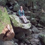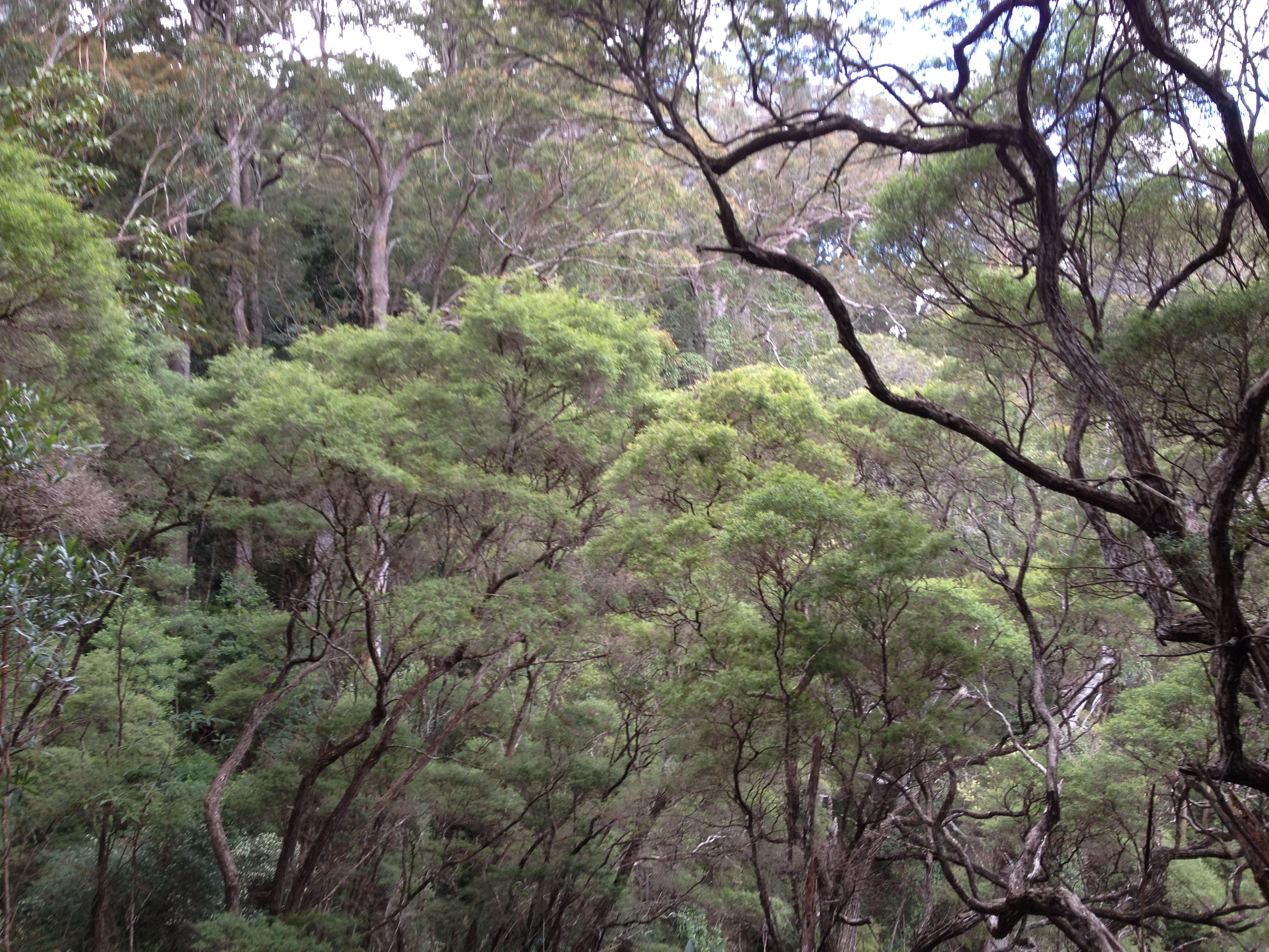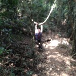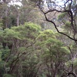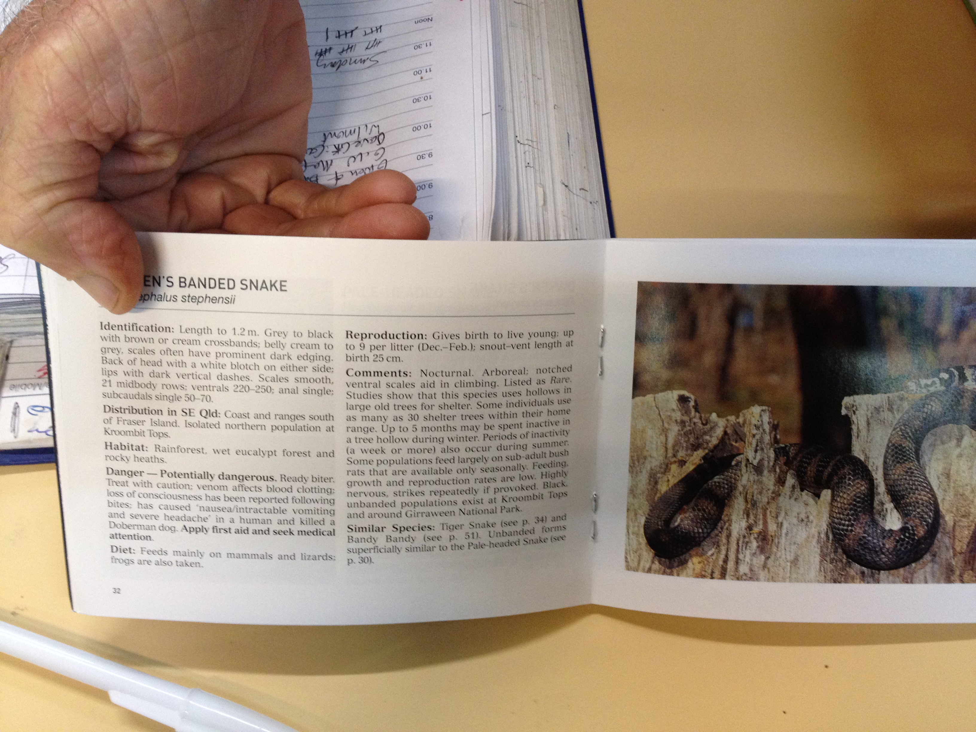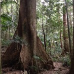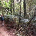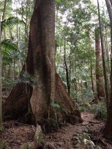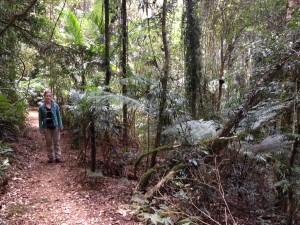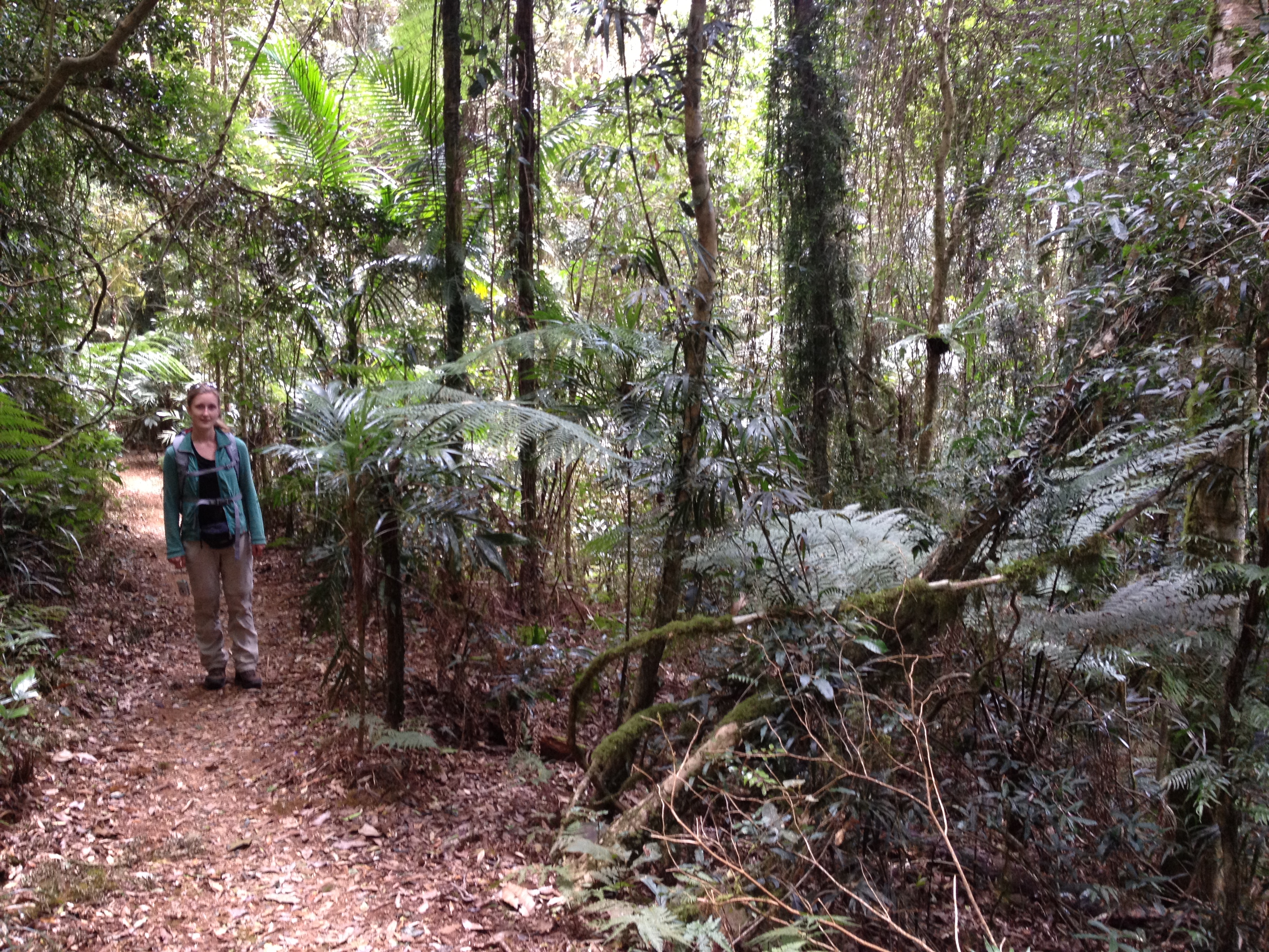 Irgendwann kam unser Weg noch mal bei dem Informationscenter vorbei und wir beschlossen, uns noch zu erkundigen, was für eine schlange wir gerade gesehen hatten. Ein netter Herr erklärte uns zunächst, dass die Schlangen sich am Hang wie Katzen in der Sonne aalen. Bei unserem erspähten Exemplar handelte es sich laut ihm um eine Stephen’s Banded Snake, keine der Top5 von der Gefährlichkeit her, aber trotzdem nicht so ohne. 😉 Es KÖNNTE übrigens auch eine Tiger Snake gewesen sein, die wäre dann definitiv unter den Top5 gewesen. Da wir schon mal hier waren, ließen wir uns noch beraten, ob es noch ein paar spektakulärere Wanderwege gab (was die Landschaft anbetraf) und entschieden uns dann zu ein paar Wasserfällen zu wandern. Es gab zwar einen Rundweg, der wurde uns aber eher nicht empfohlen, da er länger und wesentlich anstrengender war, und wir hatten schon um die Mittagszeit und um 17 Uhr sollte man eigentlich aus dem Wald draußen sein, sonst wirds stockdunkel. Also entschieden wir uns, den 5 km langen einfacheren Weg zu den Wasserfällen zu nehmen. Wir wurden noch darauf hingewiesen, dass die Bäche im Moment – da es seit 1,5 Monaten nicht mehr geregnet hat – nicht allzuviel Wasser führen, dass es aber trotzdem sehr schön wäre. Anfangs ging es ziemlich eben durch den Regenwald. Es gibt hier schon Wanderwege, die auch mehr oder weniger gepflegt werden. Also man sieht z.B. öfter einen umgestürzten Baum, der den Weg blockiert hat, der wird aber nicht wie bei uns komplett weggeräumt. Hier wird einfach das Stück, dass den Weg blockiert hat, herausgesägt und der Rest bleibt einfach liegen. Die Vegetation besteht hauptsächlich (soweit wir das beurteilen können) aus Eukalyptus, verschiedenen Palmensorten, Farnen und Würgefeigen.