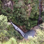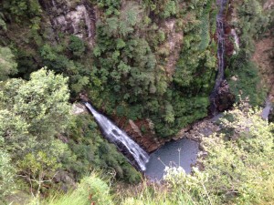 Irgendwann änderte sich das Bild etwas und hohe Gräser und Kiefern mischten sich unter die Eukalyptusbäume. Dann plötzlich sahen wir den ersten Wasserfall, der eine Felswand gegenüber von unserem Weg hinunterstürzte. Das war schon toll, aber ein paar Meter weiter gab es eine Aussichtsplattform und der Blick, der sich uns hier bot, war unbeschreiblich. Zwei Wasserfälle stürzten in ein kleines Becken, das geschätzt 50 m unter uns lag. Einer floss über eine grün bewachsene Felswand in die Tiefe, der andere stürzte mehr, war aber nicht ganz so hoch.