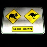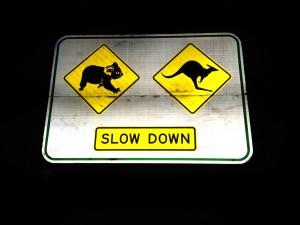 Wir hielten die ganze Zeit Ausschau nach Känguruhs, da wir ja immer noch keine gesehen hatten und überall Warnschilder standen, die einen dazu ermuntern sollten langsam zu fahren. Irgendwann dachte Mirjam, sie hätte eins gesehen. Also hielten wir an. Beim Zurückgehen sahen wir in einer anderen Richtung tatsächlich eins! Es war wohl eher ein Wallaby, also eine kleine Känguruhart und vielleicht 200 m entfernt. Kurz bevor wir es fotografieren konnten, hüpfte es dann aber weg. Das erste erspähte Känguruh entpuppte sich übrigens als Kuh. 😉