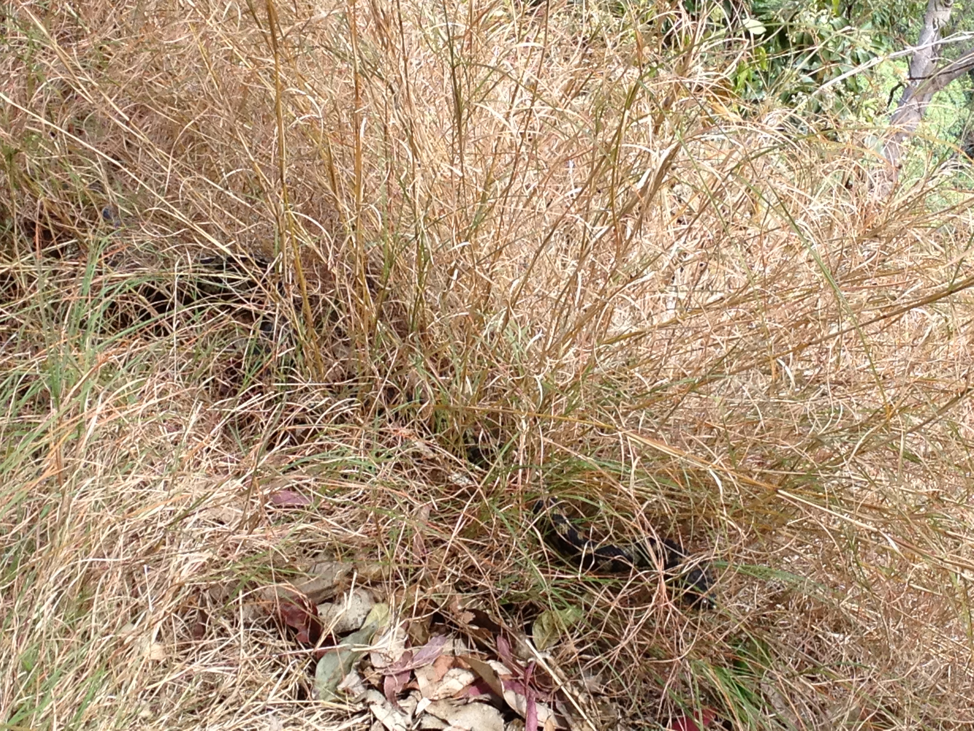Anschließend ging der Weg weiter am Hang entlang und gab einige Ausblicke frei. Als wir an einem dieser Punkte anhielten um Fotos zu machen, hörten wir es plötzlich am Wegesrand im Gras rascheln. Eine Begegnung der dritten Art. Nein, natürlich nicht. Es handelte sich nur um eine Schlange. Nur? Wie sich später herausstellte, war es dann doch keine ganz ungefährliche Schlange. Hätten wir das vorher gewusst, wären wir wohl nicht so nah an sie herangetreten, um gute Fotos machen zu können, da sie sich an einem Hang im dichten Gras versteckte und die Sonne genoss (später mehr). Sie war schwarz mit olivgrünem Muster und mindestens 1,5m lang (schwer zu schätzen, da sie sich – wie man das als Schlange so macht – durchs Gras schlängelte). Wer es wagt, kann sich hier ein paar Eindrücke holen (nicht super toll, aber man kann etwas erkennen):