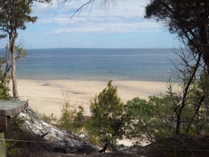 Kurz bevor wir die Siedlung verließen, hatte Benny noch eine Unterhaltung mit einem Baggerfahrer, der uns auch noch mal unsere Route etwas genauer erklärte. Dann ging es los. Nachdem wir einen Berg hochgekeucht waren, mussten wir anschließend durch einen Dingo-Zaun hindurch. Wir scherzten etwas, dass er vielleicht eher die Menschen im Resort einsperren sollte, als die Dingos draußen halten, aber es war schon ein bisschen ein Gefühl als ob man in einen Raubtierkäfig geht. 😉 Der Weg führte anfangs an der Küste entlang, wo sich mal wieder schöne Ausblicke ergaben: