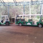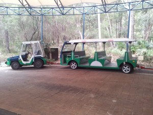 Auf der Insel angekommen, mussten wir erst einmal herausfinden, wo unser Weg begann. Außerdem war uns gesagt worden, dass wir uns und unser Ziel bei einem Ranger registrieren sollen, damit im Fall der Fälle ungefähr klar ist, wo sie uns suchen sollen. 😉 Wir suchten deshalb einen Ranger, den wir nach einiger Zeit in einem dieser Touristenpark-Züge fanden. Falls unklar ist was damit gemeint ist hier ein Foto von dem Zug: