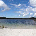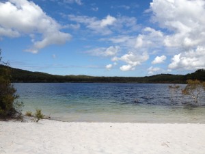 Die ganze Tortur hatte dann aber noch einen positiven Nebeneffekt: Die Strecke verkürzte sich um 1 km, so dass wir nur knapp 12 km laufen mussten. Und dann war es irgendwann soweit: Nach ca. 5h walking konnten wir endlich durch die Bäume Wasser schimmern sehen! Und ein paar Meter weiter gab es dann auch eine Möglichkeit, an den weißen Traumstrand zu gelangen. Diesen hatten wir mal wieder komplett für uns, also konnten wir uns die schönste Stelle aussuchen, um uns niederzulassen. Endlich im Paradies angekommen. Das beste war jetzt, die Schuhe auszuziehen! 😀 Und dann in das glasklare Wasser rein (Benny komplett – u.a. um die Unterwasserwelt zu filmen -, Miri nur bis zu den Knien), einfach göttlich. Die Seen auf Fraser Island sind deswegen so klar, weil sie allein durch Regenwasser gefüllt werden, d.h. es gibt weder einen Zu- noch einen Ablauf. Und dann spielte auch noch das Wetter mit und die Wolken verzogen sich: