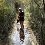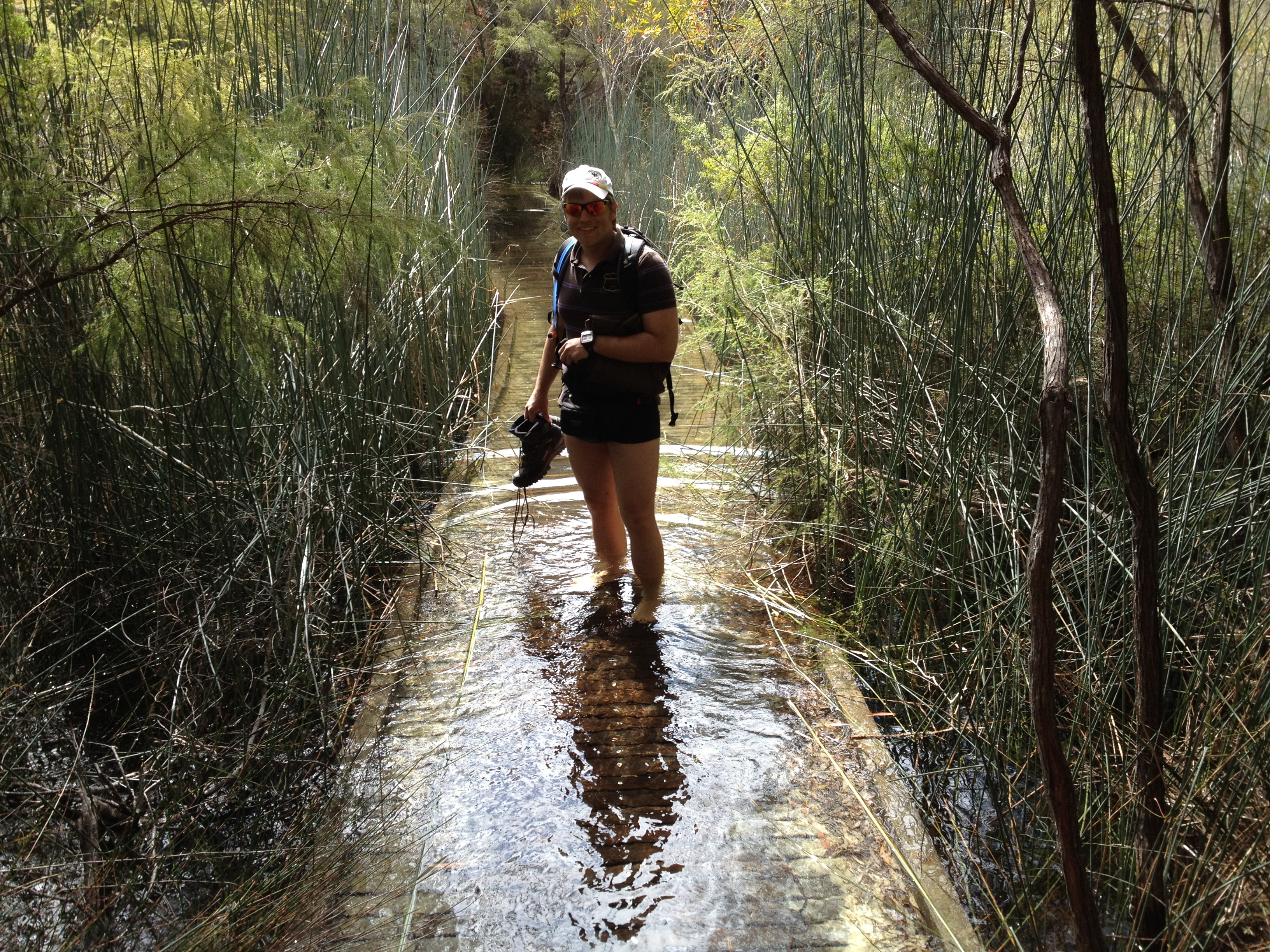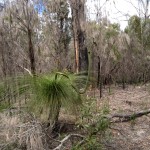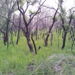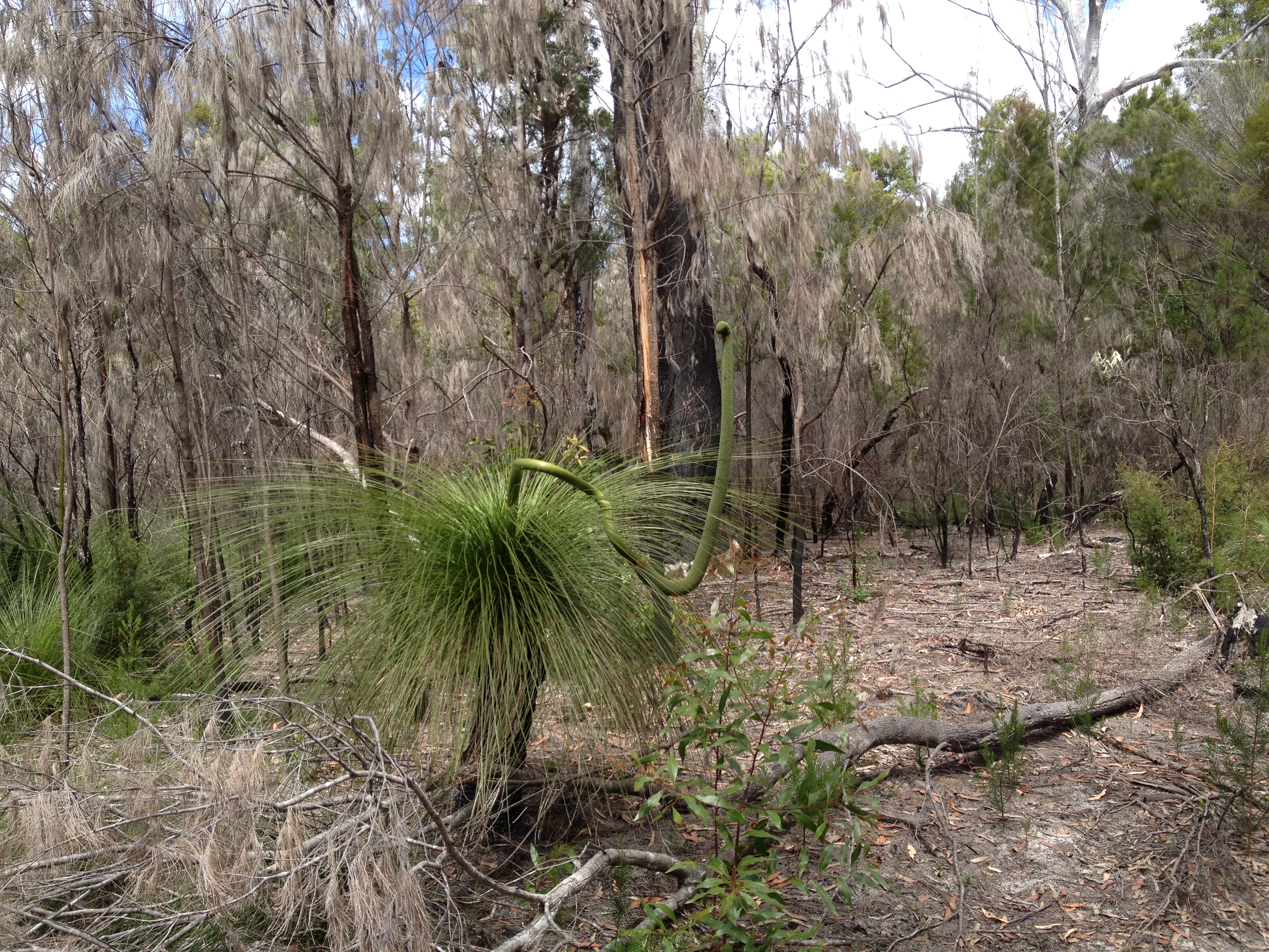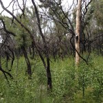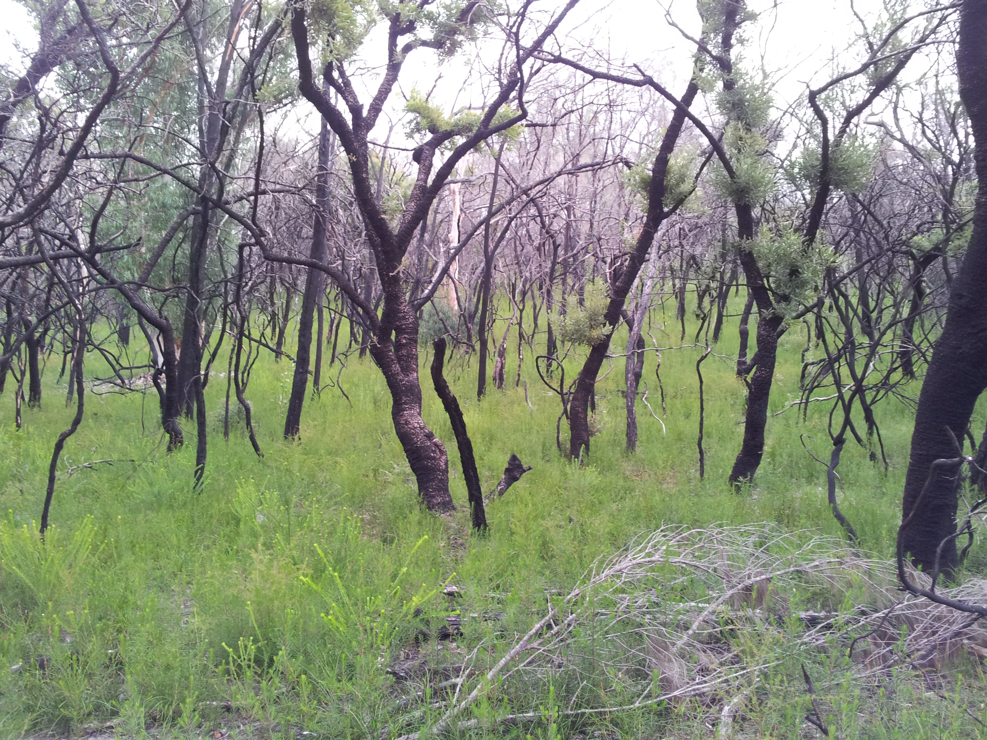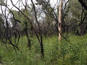 Bisher war unser Weg gut ausgeschildert gewesen. Jetzt aber plötzlich wurde es etwas seltsam, denn der Weg, den wir laut Karte und Wegweiser nehmen sollten, war gesperrt mit dem Hinweis dass er aufgrund von Waldbränden, die dort geherrscht hatten, zu gefährlich zum Passieren war. Tja, wir hatten schon 4 km hinter uns und hatten genug Kilometer insgesamt zu gehen, dass eine Rückkehr nicht wirklich in Frage kam. Außerdem hatten wir zwei Rangern erzählt, dass wir diesen Weg nehmen wollen und keiner hatte uns gesagt dass er gesperrt ist. Also versuchten wir unser Glück, da wir daher annahmen, dass man nur mit den 4WDs nicht passieren durfte, wegen einer großen Kette, die den Weg versperrte. Und man muss sagen, unserem Empfinden nach war der Weg nicht wirklich gefährlich, das Hauptproblem waren eher die vielen umgestürzten Bäume, die den Weg versperrten – ein weiterer Hinweis, dass wir wohl richtig vermutet haben. Aber durch unseren Mut zum Risiko wurden wir belohnt mit einem echten Zauberwald. Die Stämme der Bäume waren allesamt schwarz verkohlt (außer die Eukalyptusbäume, die sich scheinbar schälen können nach einem Brand und dadurch mit ganz heller Rinde dastehen), der Boden und auch die Wipfel waren aber längst wieder total grün bewachsen und zwischendrin standen seltsame Nadelbäume, die ganz silbern waren. Wir kamen uns vor wie bei Hänsel und Gretel.