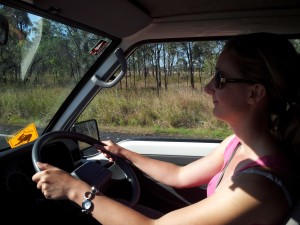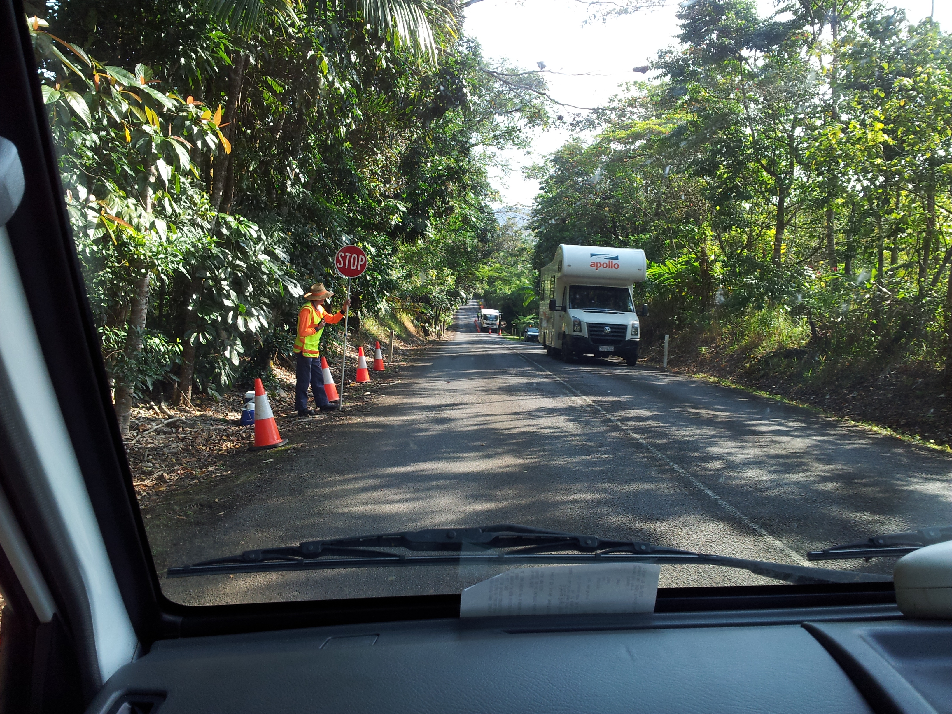 Direkt nach dem Aufstehen ging es weiter und wir frühstückten dann in Rockhampton, der selbsternannten Beef-Hauptstadt. (Zu Bennys Enttäuschung hielten wir uns aber erst einmal nicht weiter hier auf – wir kommen ja noch einmal hier vorbei). Und so sieht es hier auch aus: riesige Grasflächen mit ein paar Bäumen und ein paar Kühen und das über hunderte von Kilometern. Für Abwechslung sorgten da hauptsächlich die Baustellen, die langsam nervig wurden. Das lustige ist aber, dass hier oft der Verkehr nicht wie bei uns von einer Ampel, sondern von Menschen geregelt wird, die ein Schild hochhalten, auf dem auf der einen Seite „Stop“ und auf der anderen „Slow“ steht. Wenn man dann fahren darf, bekommt man meistens noch einen kumpelhaften Wink, als ob man denjenigen schon ewig kennt. 😀