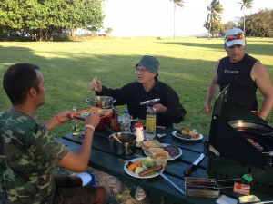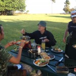 Danach dann noch schnell einkaufen, Barbecue anschmeißen und anschließend wollten wir dann weiter gen Norden. Das Barbecue heizte schon, der Reis stand auf dem Gaskocher, da musste Benny noch schnell auf die Toilette. Miri musste jetzt also auf den Reis aufpassen, der auf dem Tisch stand und noch ein Auge auf das ca. 20m entfernte BBQ haben. Nachdem Benny nach einer guten Viertelstunde immer noch nicht wieder aufgetaucht war, kochte nicht nur der Reis… War er steckengeblieben? Ein paar Minuten später konnte sie ihn dann immerhin wieder von Fern sehen, total vertieft in ein Gespräch mit einem Unbekannten. Es vergingen weitere Minuten (der Reis war mittlerweile fast gar), ohne dass die zwei näher kamen. Also musste was unternommen werden. 😉 Schnell zum Toilettenhäuschen gesprintet, die zwei aufgefordert ihr Gespräch am BBQ fortzusetzen, zurück zum Reis (hoffen dass er nicht angebrannt ist) und dann mal in Kenntnis setzen lassen, um was es in dem Gespräch eigentlich geht. Bei dem Unbekannten handelte es sich um Andre, einen Deutschen, der seit 4 Jahren in Australien lebt und zufälligerweise… Tauchlehrer ist! Da konnten wir uns natürlich noch einige hilfreiche Tipps abholen, da wir ja auch noch Tauchen gehen wollen. Irgendwann verabschiedete er sich dann, kam aber als wir mit dem Essen fertig waren wieder (um sich auch ein paar Würstchen zu bruzzeln), und letztendlich verquatschten wir den ganzen Abend (Er erzählte uns einige interessante Sachen über Australien, deshalb kamen wir nicht weg. War einfach zu spannend 🙂 ). Irgendwann lohnte es sich dann auch nicht mehr für uns, noch loszufahren, also beschlossen wir, die Nacht noch in Townsville zu verbringen. Andre – der eigentlich in Cairns lebt – war für eine Fortbildung in Townsville und schlief im Zelt auf einem Platz am Meer (eigentlich mißbrauchte er einen Kinderspielplatz, da in Australien die meisten Spielplätze mit einem extra soften Boden ausgestattet sind, so dass man dort sehr bequem darauf schlafen kann), wo wir dann auch unser Nachtlager aufschlugen.