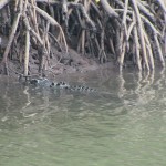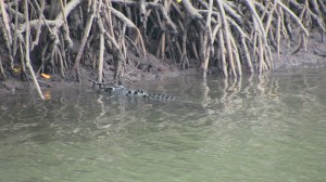 Der Skipper entdeckte direkt schon ein kleines Krokodil, das wir (und auch einige andere Leute auf dem Boot) leider nicht sehen konnten. Aber zum Glück sollte die Fahrt ja noch etwas länger dauern. Plötzlich, nach einiger Zeit, sahen wir auch eines: Es lag im Wasser, der Kopf schaute Richtung Ufer und es war über 4 m lang (laut Bootsführer)! Die Salzwasserkrokodile können zwar 8 m lang werden, aber das hier war auch schon ein recht beachtliches Exemplar. Leider zeigte es nicht mehr von sich als seine Augen: