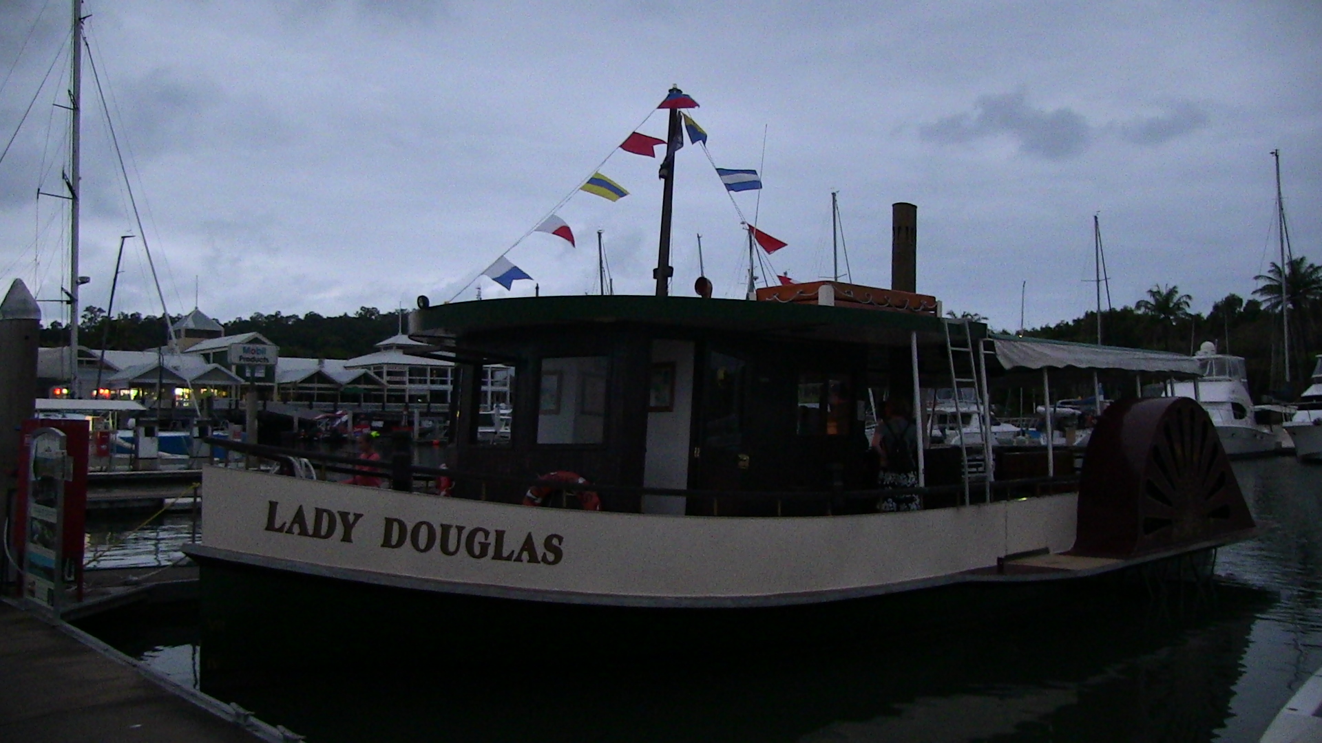 In Port Douglas angekommen, ging es erst einmal zur Tourist Information. Wir wollten gern am nächsten Tag (Dienstag) tauchen gehen, allerdings war da leider schon alles ausgebucht. Also buchten wir für Mittwoch eine Tour auf der Poseidon mit drei Tauchgängen am Agincourt Ribbon Reef. Da es jetzt schon Mittag war, machte es nicht mehr viel Sinn noch weiter nach Cape Tribulation zu fahren (wo wir ursprünglich hinwollten). Stattdessen beschlossen wir, noch bei einer Sunset-Crocodile Watching Tour mit einem Schaufelradschiff, der Lady Douglas, mitzufahren.