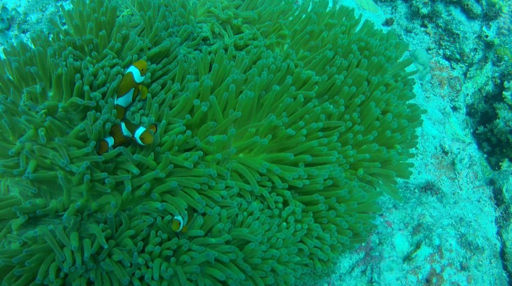 Beim zweiten Tauchgang dann sahen wir einiges an Tieren, unter anderem Tintenfische, die echten Clownfische (Nemos) und eine Meeresschildkröte!