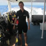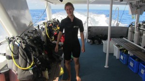 Auf dem Schiff wurden wir sehr nett begrüßt, mussten allerdings unsere Schuhe an Land zurücklassen. Dann ging es ans Ausfüllen der Fragebögen, wo wir zu unserer Tauchvergangenheit Angaben zu machen hatten. Dann gab es Muffins zu essen und eine kurze Einführung von Jeff, der auch später unser Tauchguide werden sollte. Und kurz darauf ging es auch schon raus in den Außenbereich, wo die Tauchgeräte aufgebaut waren und es gab noch eine spezielle Einführung zu unserem ersten Tauchspot.
