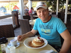 Heute gab es mal ein richtig geniales Frühstück. Miri hatte am Tag zuvor ein Restaurant am Hafen entdeckt, wo es Pancakes mit Karamelsauce, Mascarpone und karamelisierten Walnüssen gab. Das konnten wir uns natürlich nicht entgehen lassen! Wir wären zwar beinahe geplatzt und eine heftige Kalorienbombe war es auch (wir hatten den ganzen Tag keinen Hunger mehr), aber es war super lecker. 🙂