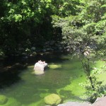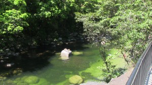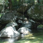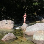 Dann kamen wir am Fluss an, an eine wunderschöne Stelle, die Touristen nur durch eine geführte Tour zugänglich ist. Dort erklärte Ronny uns erst noch, was die Körperbemalung bedeutet, die die Aboriginees traditionell auftragen. Interessant war, dass scheinbar jeder Stamm seine eigenen Muster hatte. Dann durften wir in dem Fluss baden. Das Wasser dort gehört zu den drei reinsten in ganz Australien und es war wirklich eine tolle Erfahrung hier sein zu dürfen, denn man spürte wirklich die besondere Ausstrahlung, die von diesem Ort ausging. Das einzige etwas unangenehme war, dass das Wasser verdammt kalt war – zumindest im ersten Moment. Wir wurden damit belohnt ein paar Fischlein zu sehen, Schildkröten und Aale, die auch darin beheimatet sind konnten wir aber leider nicht entdecken.