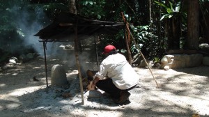 Wir verließen Port Douglas mit etwas Wehmut, denn hier hatten wir bisher am längsten „gewohnt“. Aber das hielt nicht lange an. Im Mossman Gorge Visitor Centre angekommen, buchten wir unsere Tour und wurden kurz darauf von einem kleinen Bus und unserem Guide Ronny abgeholt, die uns tiefer in den Urwald fuhren. Am Startpunkt angekommen, bereitete Ronny eine Rauchzeremonie vor, die dafür sorgen sollte, dass wir (außer uns war nur noch ein Ehepaar dabei) mit einem positiven Gefühl in ihr Gebiet gehen und es auch mit guten Gedanken wieder verlassen sollten.