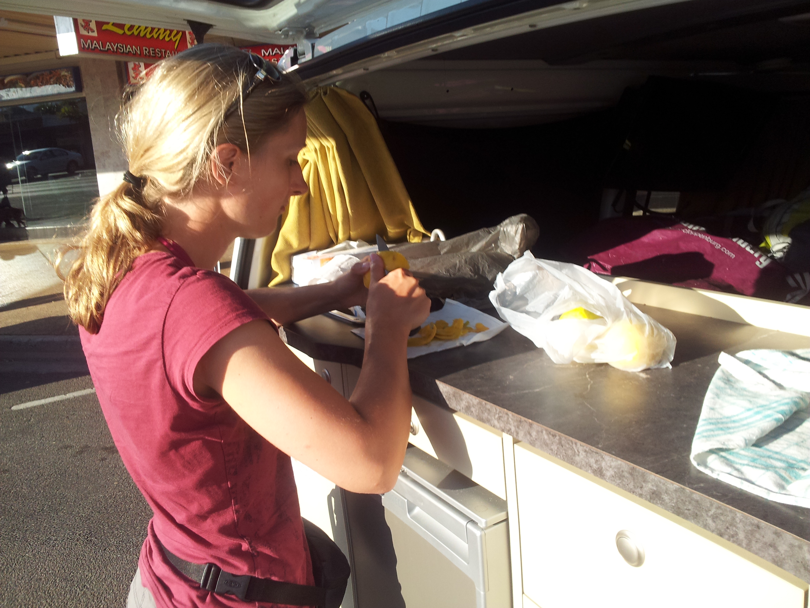 Irgendwann mussten wir dann leider wieder los und fuhren in Richtung Cairns. Auf dem Weg hielten wir an einem Obststand und kauften ein paar Mangos (um genau zu sein: ZWEI, da diese aber einen krummen Betrag kosteten, hatte der Verkäufer wohl keine Lust uns das passende Wechselgeld zu geben und hat uns deshalb kurzerhand eine weitere geschenkt). Die erste verspeisten wir direkt als wir in Cairns angekommen waren. Ein Gedicht! Sie waren viel kleiner als die, die man in Deutschland bekommt, aber tausend mal aromatischer. Anschließend waren wir dann noch kurz in einem Tauchshop, da wir darüber nachdenken, uns noch einen eigenen Tauchcomputer zuzulegen. Allerdings war der Preis, obwohl sie uns noch einen guten Rabatt gegeben hätten und es bei größeren Anschaffungen 10% am Flughafen zurück gibt, nicht konkurrenzfähig mit denen in Deutschland. Also haben wir das noch mal verschoben, da man auf den Tauchbooten auch einen Computer ausgeliehen bekommen kann.
