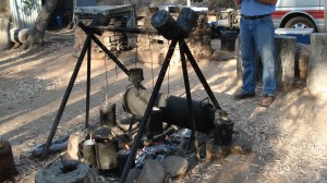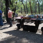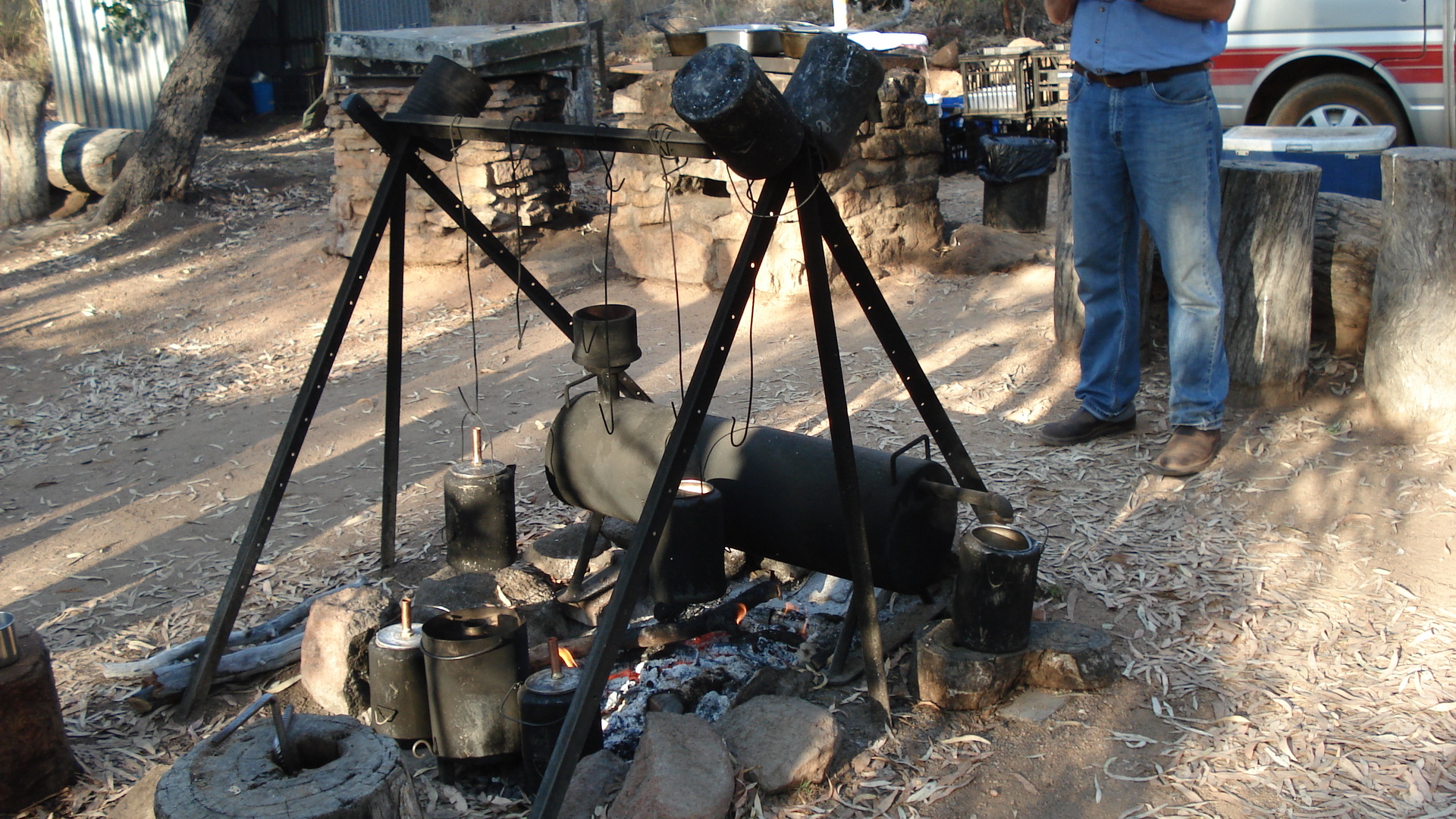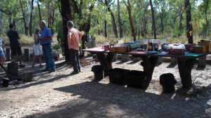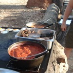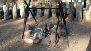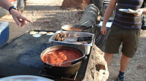 Die Getränkezubereitung (Kaffee und Tee) erfolgte in allen möglichen Gefäßen. Wie uns erklärt wurde, benutzten diese die ersten Siedler, um an bestimmten Orten auf ihren (sehr weitläufigen) Farmen, die sie mehrmals im Jahr wieder aufgesucht haben, z.B. um das Vieh zusammenzutreiben, eine Kochgelegenheit zu haben. Auch für das Rösten von Toastbrot gab es spezielles Besteck, womit man sich selbst sein Brot toasten konnte. So mancher hatte damit so seine Probleme, ein Engländer hat es geschafft, drei Toasts auf einmal in die Glut zu befördern (Um ehrlich zu sein, sah dieser Typ auch aus als ob seine Mama ihm jeden morgen sein Frühstück macht und deshalb wohl total überfordert war 🙂 ). 😀