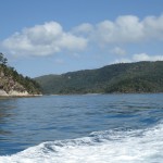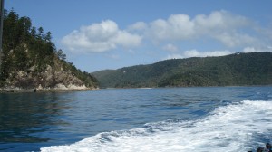 Um 8 Uhr sollte unser Boot losfahren und diesmal waren wir – gar nicht typisch deutsch – die letzten und alle warteten schon auf uns (es war ca. 7.45 am). 😀 War aber nicht weiter schlimm und wir konnten direkt losfahren. Nachdem wir wieder den üblichen Papierkram für die Tauchgänge ausgefüllt hatten, konnten wir dann einfach die Fahrt genießen, die ca. anderthalb Stunden dauerte. Das Wetter war traumhaft und die See spiegelglatt mit einer tollen türkisnen Farbe. Die Whitsunday Islands bestehen insgesamt aus 74 einzelnen Inseln, die zum größten Teil unbewohnter Nationalpark sind.
