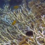 Rein in den Tauchanzug, Flasche auf den Rücken, Mundstück in den Mund und rein ins feuchtfröhliche Nass. Den ersten Tauchgang begannen wir vom Schlauchboot aus, also mit Rückwärtsrolle rein, eine Sache die wir so auch noch nie zuvor gemacht hatten. Und da passierte es (wie sollte es auch anders sein, wenn man etwas zum ersten Mal tut), Miris Oktopus (das ist die Ersatzluftzufuhr) blas aus. Das passiert, wenn sich die Öffnung beim Auftreffen ins Wasser nach oben dreht, bzw. nach oben zeigt. Dadurch waren direkt 50 bar an Luft weg. Das ist viel, wenn man bedenkt, dass man insgesamt nur 200 bar in der Flasche hat. Das war kein guter Start, denn damit war es schon beinahe vorprogrammiert, dass der Tauchgang (zumindest für Miri) eher kurz ausfallen würde. Der Guide teilte ihr aber noch mit, dass er sie – wenn die Flasche leer ist – mit seiner Luft versorgen würde. Es blieb auch nicht lange Zeit zum Hadern, denn wir gingen dann direkt runter und die Schönheit der Korallen und Fische ließen alles vergessen. Durch ruhige Atmung schaffte Miri es dann sogar, mit ihrer Luft so sparsam umzugehen, dass sich ihre Luft im Laufe des Tauchgangs fast noch mal an die der anderen anpasste, so dass sie nur kurz vom Guide versorgt werden musste. Am Ende des Tauchgangs entdeckten wir dann noch den größten Fisch (einer der wenigen bei all unseren Tauchgängen 🙁 ). Dieser schwamm direkt unter unserem Boot herum!