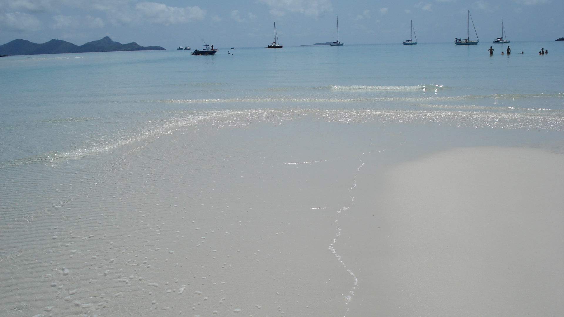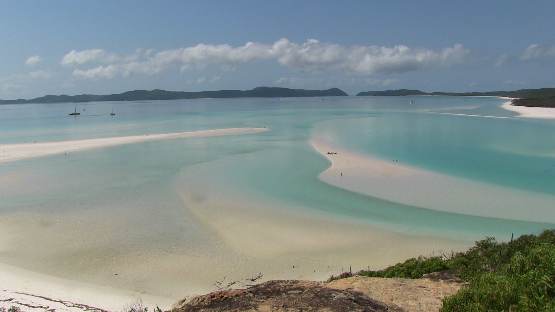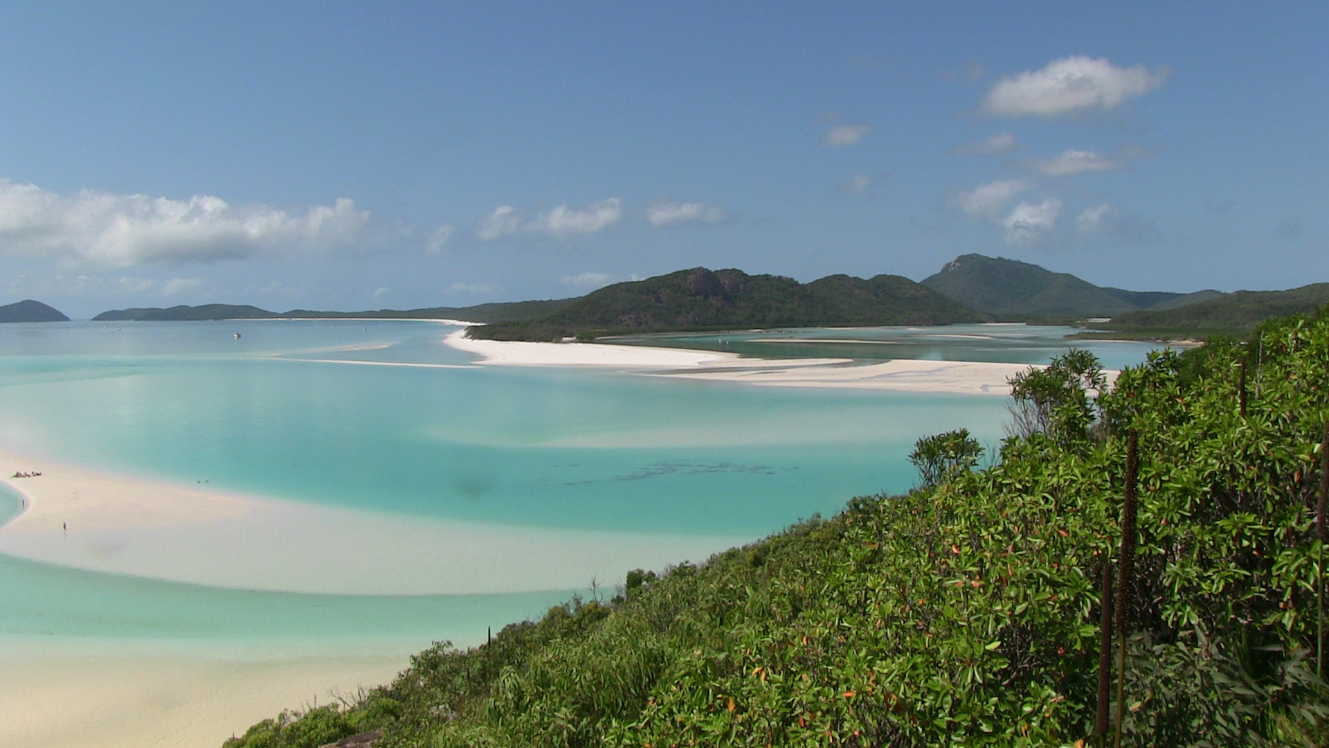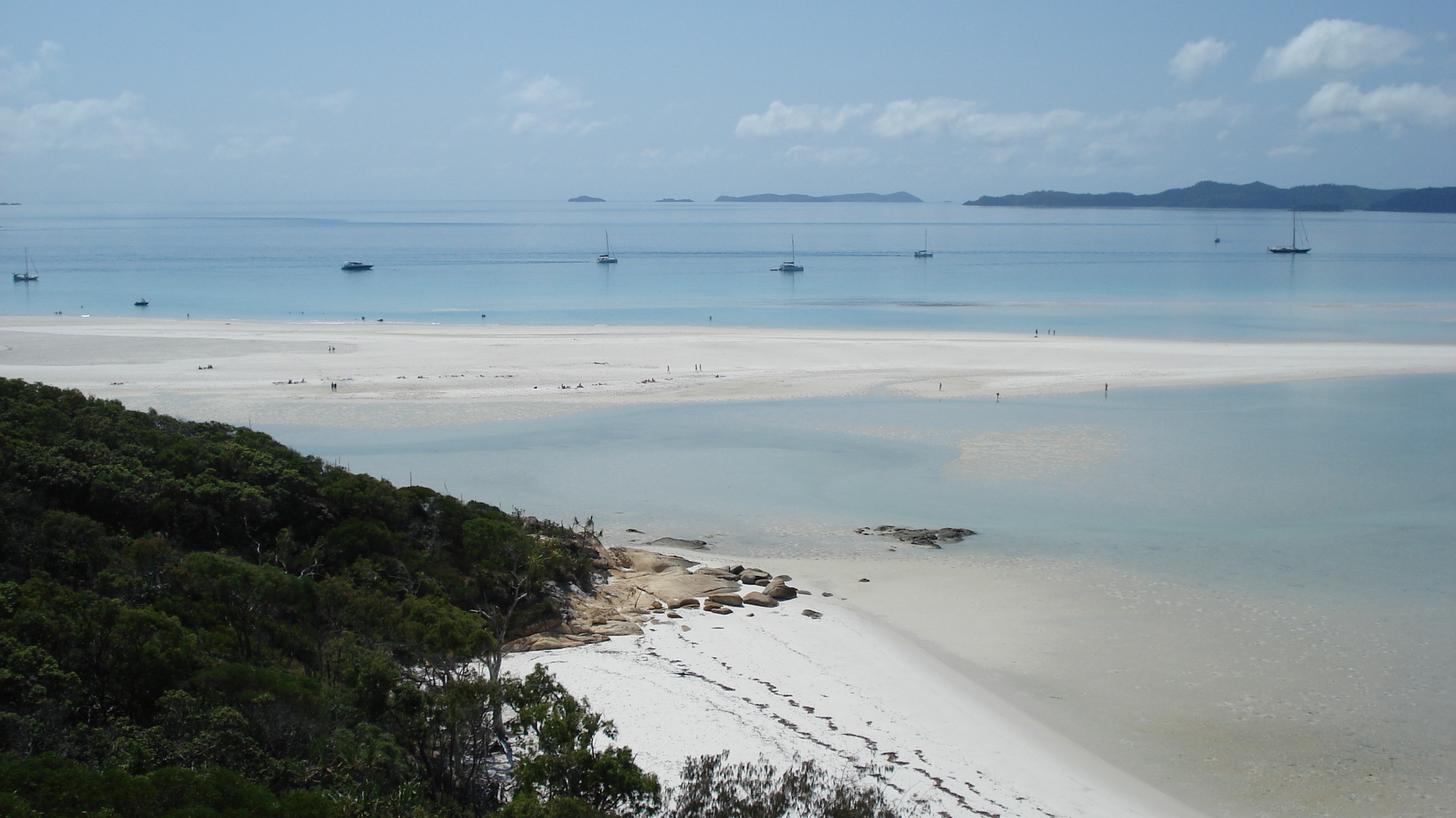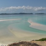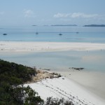 Irgendwann waren wir dann an unserem Ziel angekommen. Dies war noch nicht der Traumstrand, sondern eine benachbarte Bucht, von der aus eine kurze Wanderung zu einem Aussichtspunkt, dem Hill Inlet, geplant war. Mit einem kleinen Schlauchboot mit Außenboarder wurden wir grüppchenweise an den Strand gebracht. Als unsere Gruppe komplett war, ging es los. Nach einem kurzen Marsch durch den Busch waren wir dann oben angekommen und hatten eine fantastische Aussicht auf den Whitehaven Beach. Man kam sich vor wie im Paradies. (Weitere Fotos vom Hill Inlet in der Gallerie.)