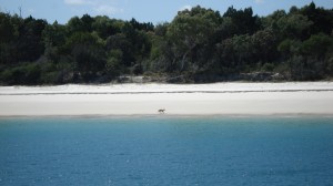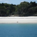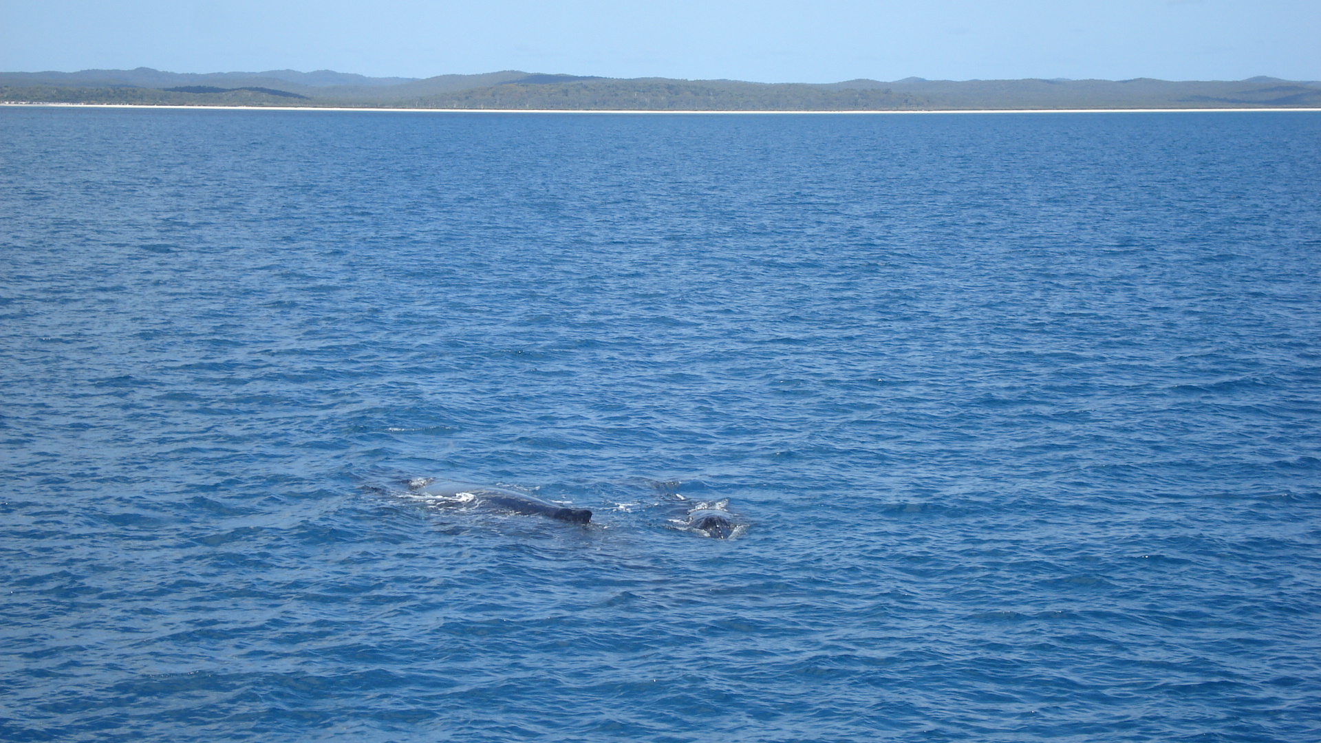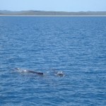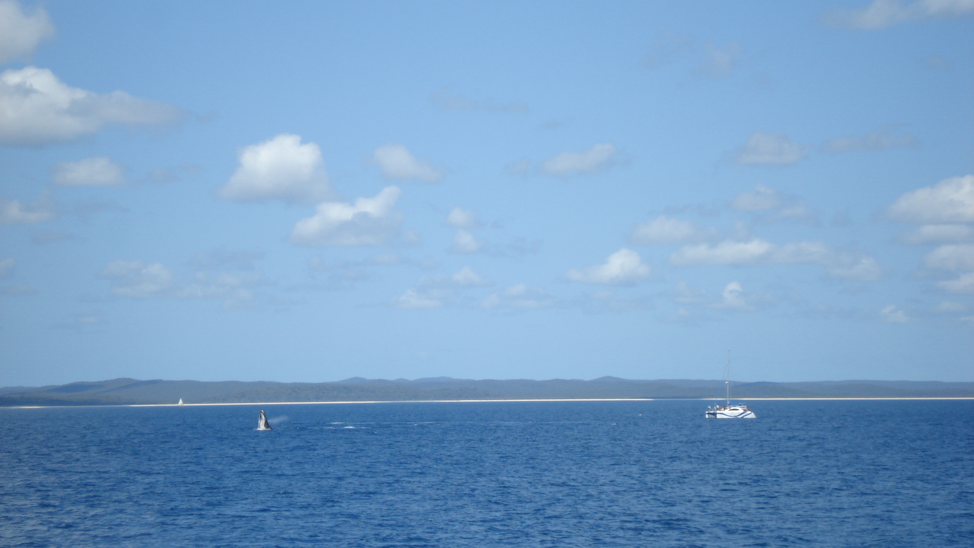 Das Schiff war ziemlich groß, mit einer rundherum verlaufenden Reling, so dass man die Wale aus jedem Winkel beobachten kann. Bei den Walen, die jedes Jahr nach Hervey Bay kommen, handelt es sich um Buckelwale, die den australischen Winter in tropischen Gewässern verbringen, dort ihre Jungen zur Welt bringen und für den australischen Sommer dann in die Antarktis schwimmen. Hervey Bay ist auf dieser Reise eine Zwischenstation, wo die Wale zum Ausruhen herkommen. Wir mussten eine gute Stunde fahren, bis wir in die Regionen kamen, wo mit Walen zu rechnen war. Auf der Fahrt, die ein gutes Stück an Fraser Island entlang führte, sahen wir aber schon andere tolle Tiere: Einen Dingo, der am Strand von Fraser Island entlang lief (schon der Zweite 🙂 ), eine Meeresschildkröte, die gerade zum Luftholen aufgetaucht war und Delfine, die vor unserem Schiff aus den Wellen sprangen (und die mal wieder zu schnell zum Fotografieren waren)!
