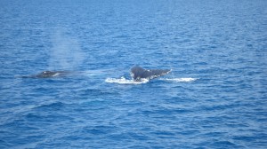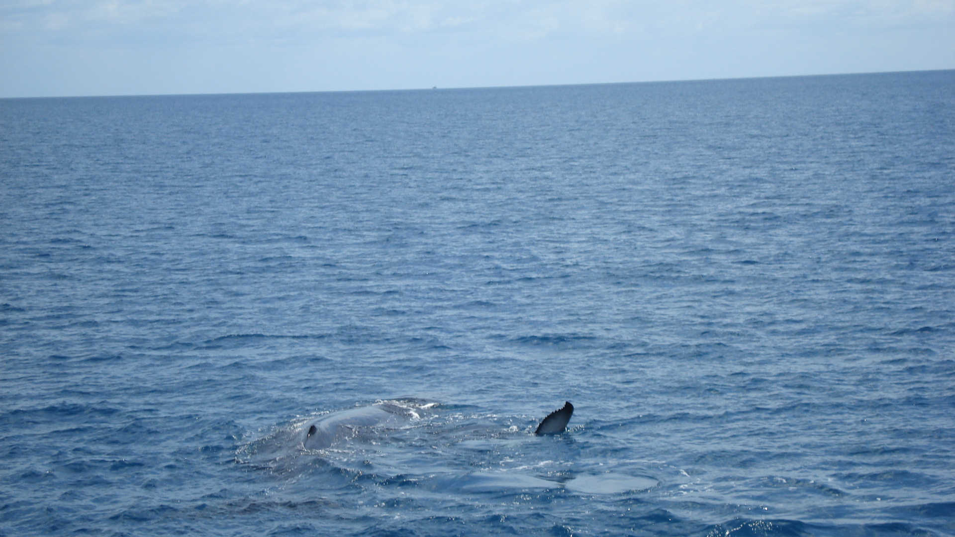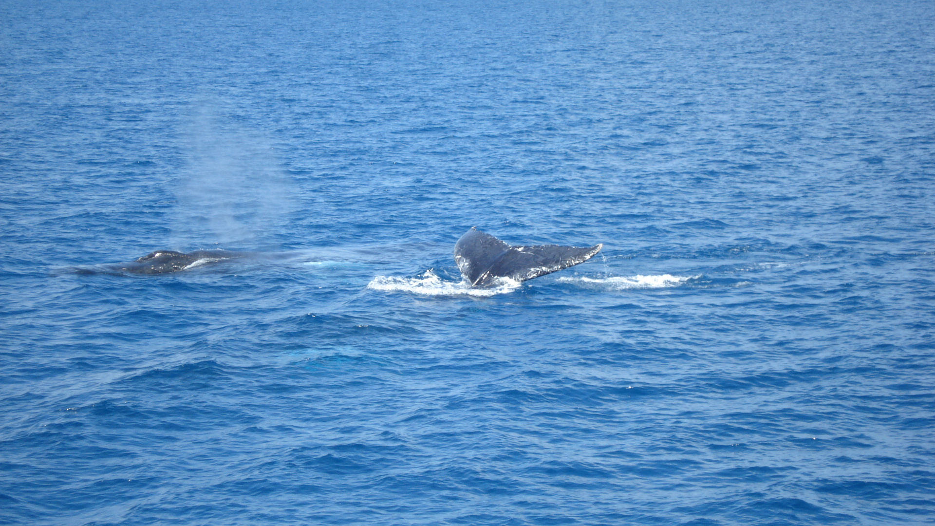 Nach einiger Zeit sahen wir dann die ersten Wale, allerdings hatte wir des öfteren Pech und sobald wir sie sahen, tauchten sie schon wieder ab, worauf stets einige Minuten Abwesenheit folgten. Das war dann auch ein bisschen der Nachteil an so einem Forschungsschiff, denn im Gegensatz zu den kommerziellen Anbietern, die – wie wir immer aus der Ferne sahen – Wale direkt neben dem Boot hatten, hielt unser Schiff immer schön Abstand und verzichtete auch darauf, den Tieren zu folgen. Das war natürlich besser für die Tiere, aber schlecht für die Paparazzi-Touristen. 😉 Dafür hatten wir ein Sonargerät an Bord, das ein paar Mal angestellt wurde und über das konnten wir den Gesang (sofern man das als Gesang bezeichnen möchte) der Buckelwale hören! Das interessante ist, dass diese Geräusche, die nur von den männlichen Tieren erzeugt werden, sich jedes Jahr ändern, aber dass von allen das gleiche Lied gesungen wird! Also es gibt quasi jedes Jahr einen „Hit“, den alle singen! Wirklich faszinierend.