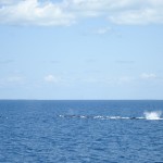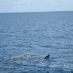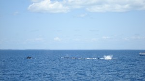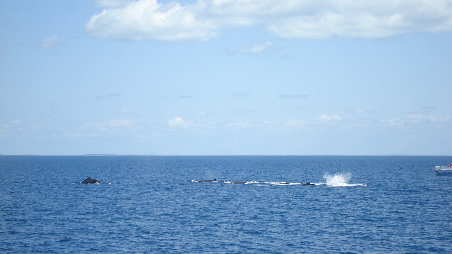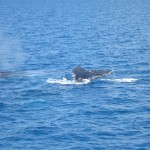 Irgendwann entdeckten wir eine Gruppe männlicher Buckelwale, was eine ziemliche Besonderheit darstellt, denn normal sind diese Tiere Einzelgänger. Diese hatten allerdings ein Weibchen erspäht, das – obwohl noch mit einem Jungen unterwegs – wieder Interesse bei der Männerwelt weckte. Die Walgruppe veranstaltete also recht spektakuläre Dinge, wie z.B. hohe Sprünge, die allerdings zum Teil auch recht aggressiv gegen die Artgenossen gerichtet waren. Leider sahen wir auch das nur aus der Ferne.