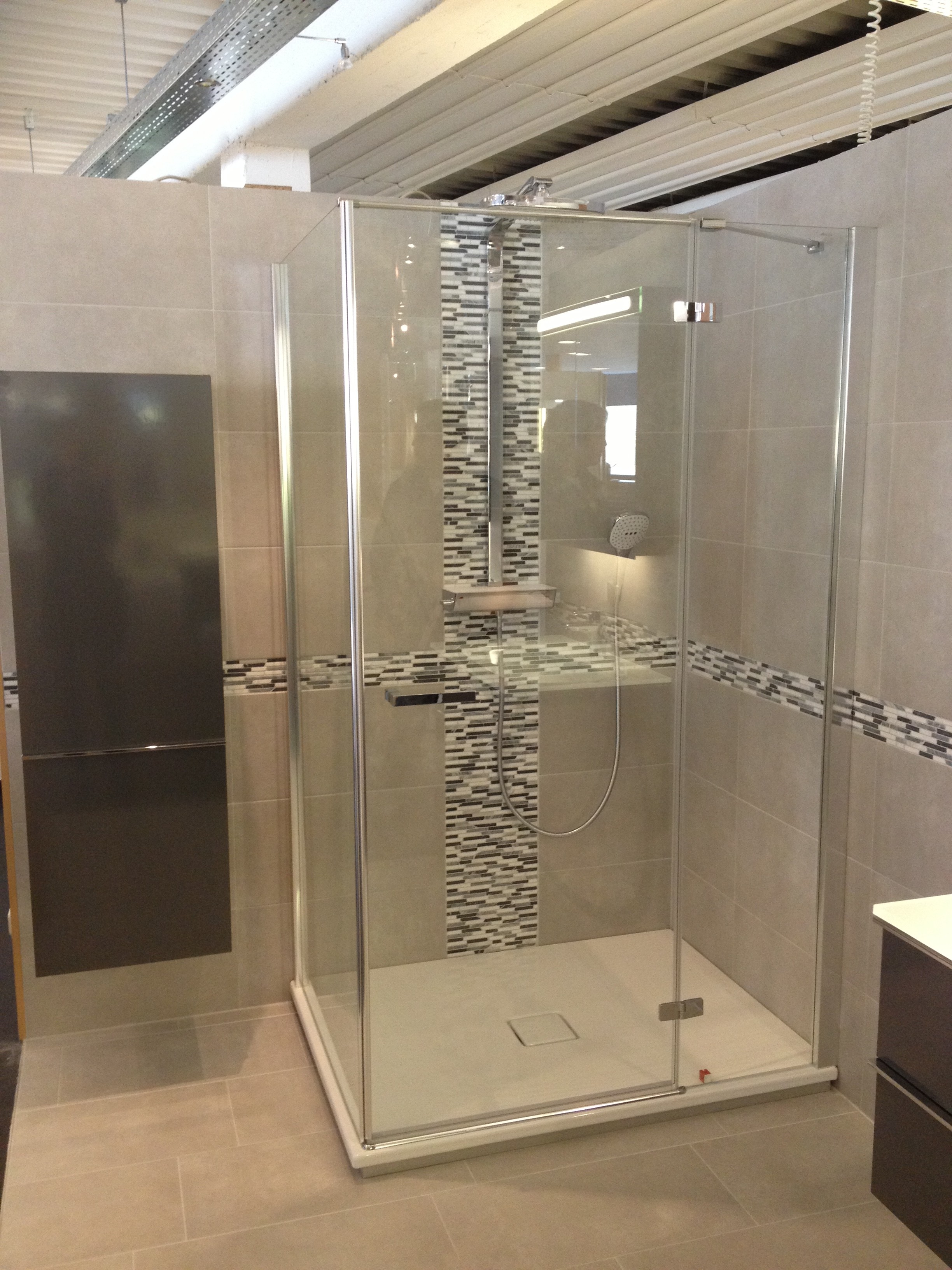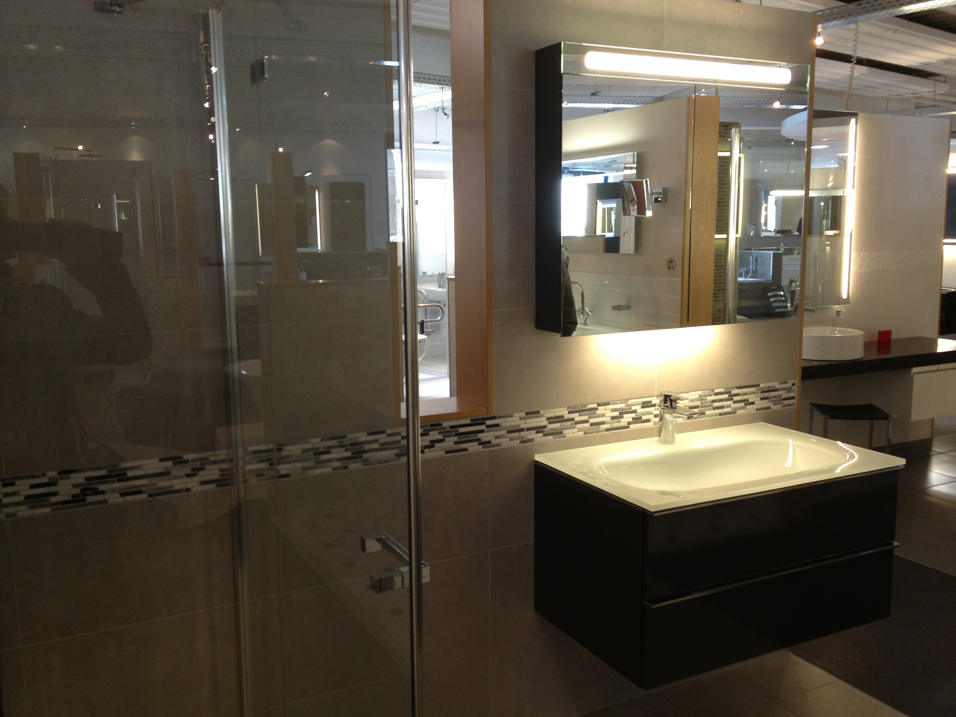 Übrigens waren wir noch mal in der Badausstellung und haben uns angeschaut, wie dort unser Waschtisch in dem neu gefliesten Ambiente zur Geltung kommt. Die hellgrauen Fliesen haben uns gut gefallen, das Mosaik werden wir aber nicht so übernehmen. Stattdessen kommt in die Dusche ein breiter Streifen aus kleinen quadratischen gleichfarbigen Fliesen.