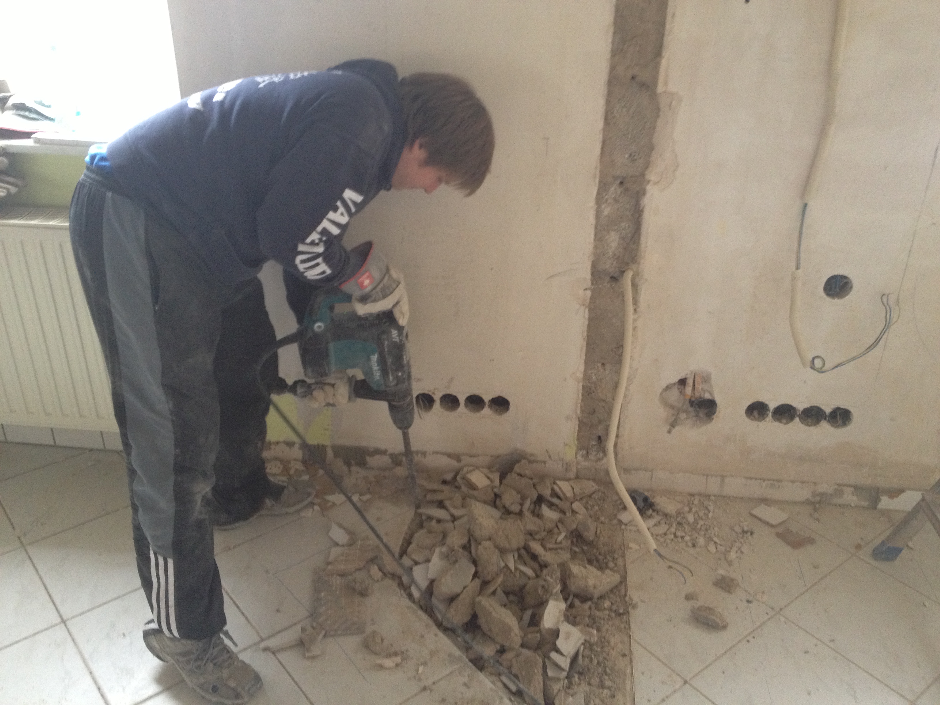 Parallel zu den Arbeiten im Lager ging es in der Wohnung weiter. Dort mussten noch Sockel- und Küchenfliesen von den Wänden runter und der Boden im späteren Badbereich aufgepickt werden, da hier eine Fußbodenerwärmung verlegt werden soll. Also ging es fröhlich ans Werk: