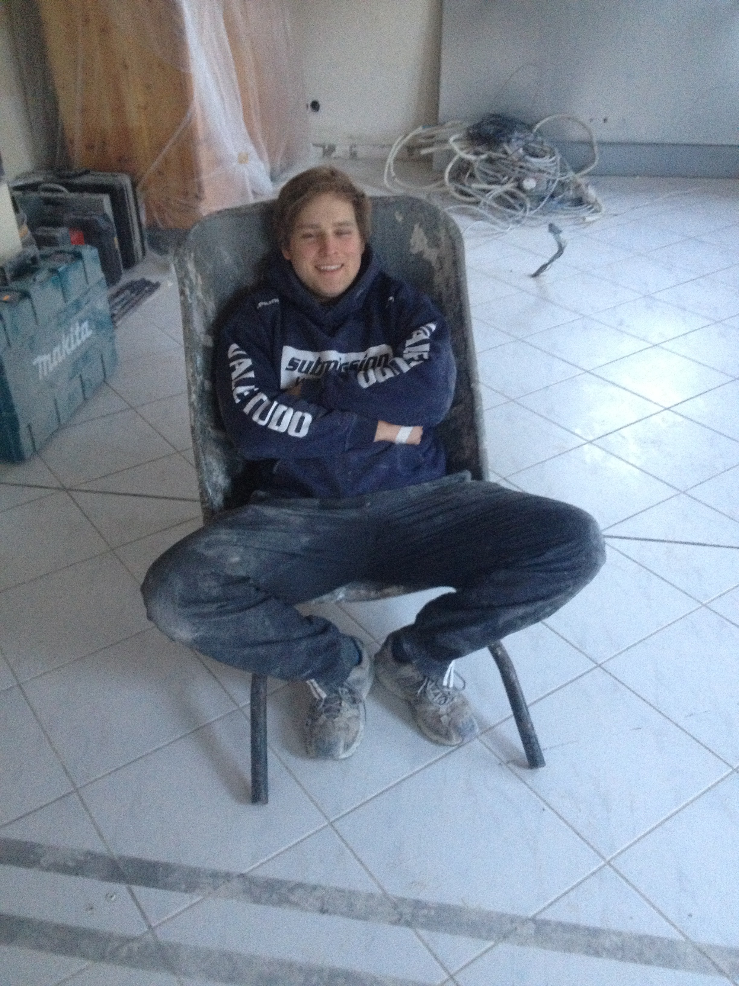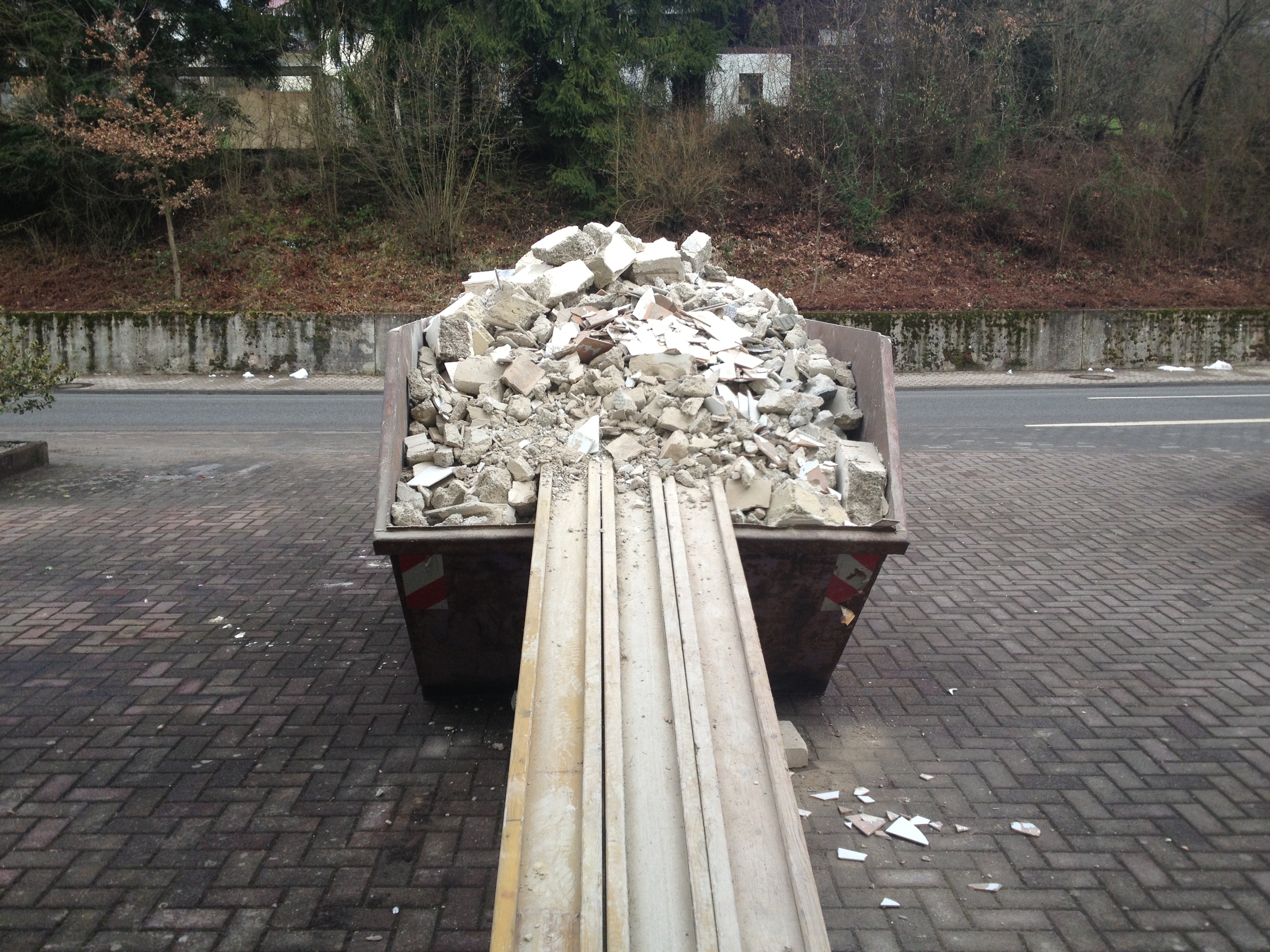 Da der Schutthaufen mittlerweile richtig groß geworden war, entschieden wir, für Samstag (also gestern) einen Container kommen zu lassen und doch erst einmal den Schutt zu entsorgen, da er für die weiteren geplanten Arbeiten – wie die Elektroinstallation – ziemlich im Weg gewesen wäre. Also rückten wir gestern erneut tatkräftig an und in 3h hatten Benny und Simon alles im 7,5 Kubikmeter Container verstaut.