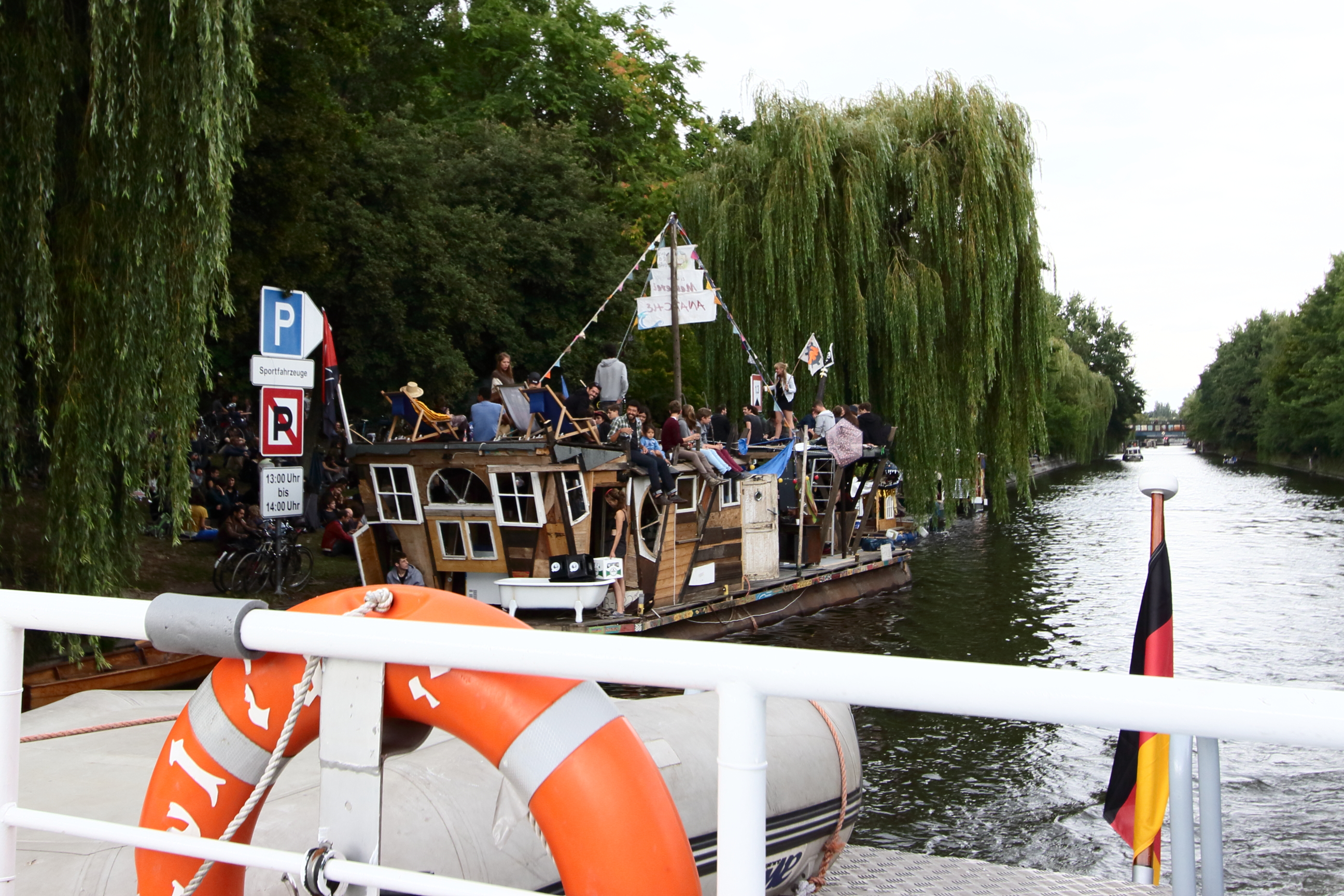 Zuerst ging es die Spree entlang, vorbei an Museumsinsel und prächtigen Gebäuden, bis zu dem Molecule Man, den wir schon vom Ufer aus gesehen haben, um dann anschließend auf dem Landwehrkanal zwischen Treptow und Kreuzberg hindurchzufahren. Hier zeigt sich Berlin von seiner grünen und freundlichen Seite, denn gewunken wurde uns hier ständig. Laut Nasti können das aber nur Touristen gewesen sein, denn Berliner würden den Touris niemals winken. 😉
